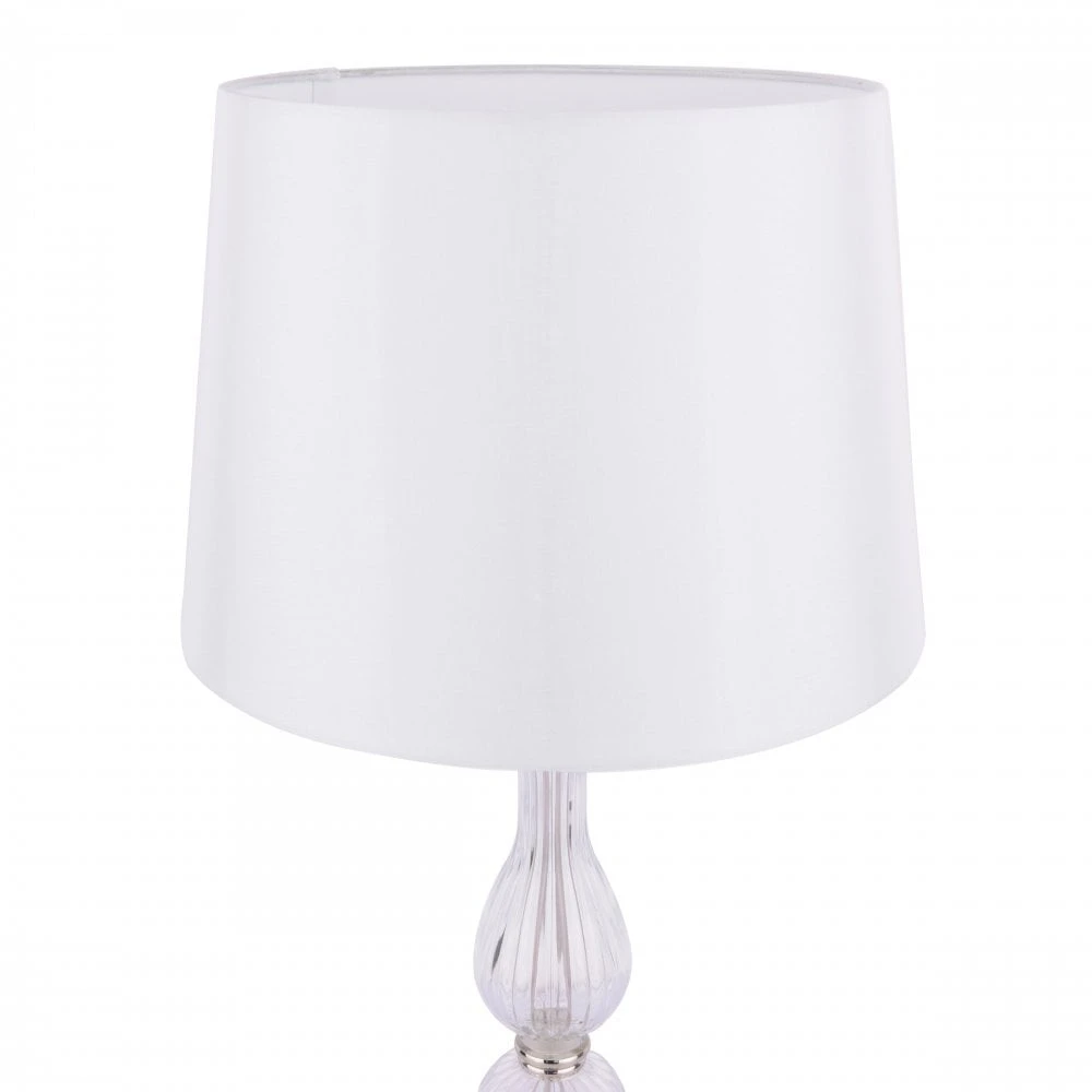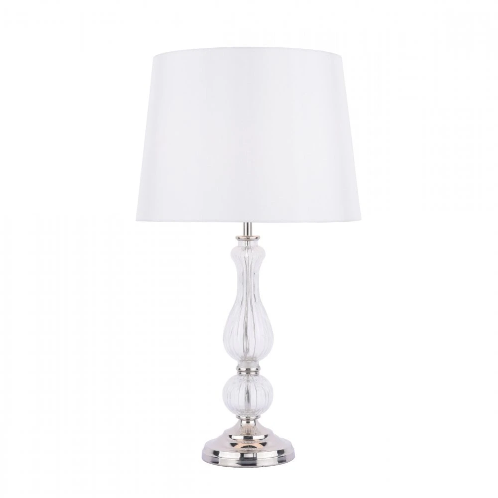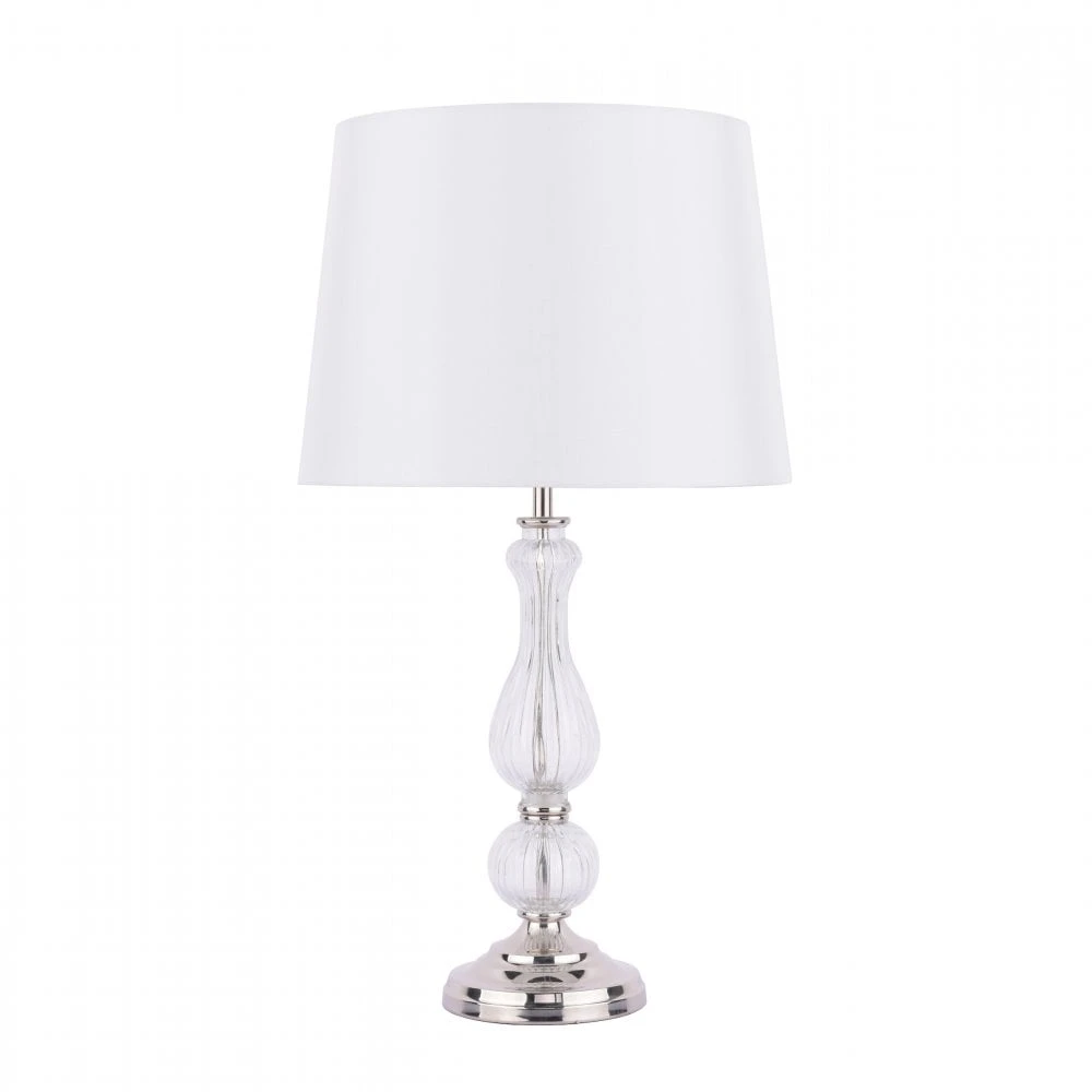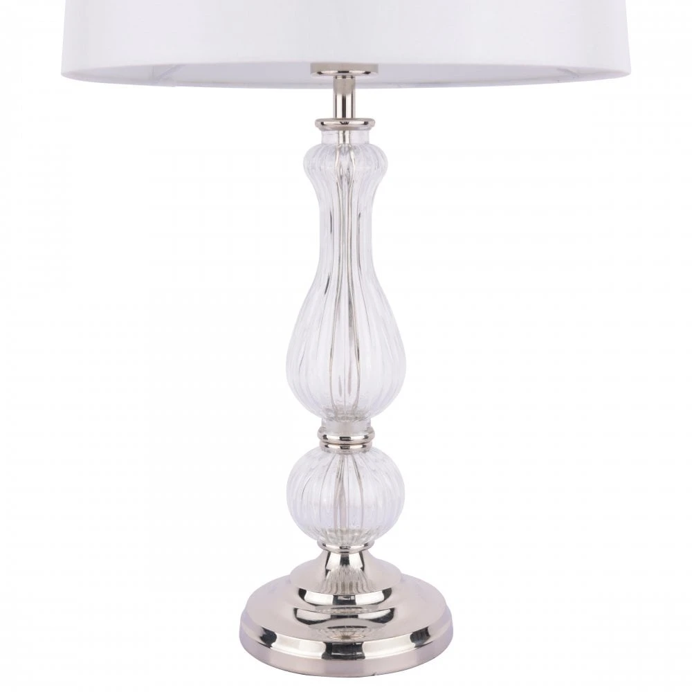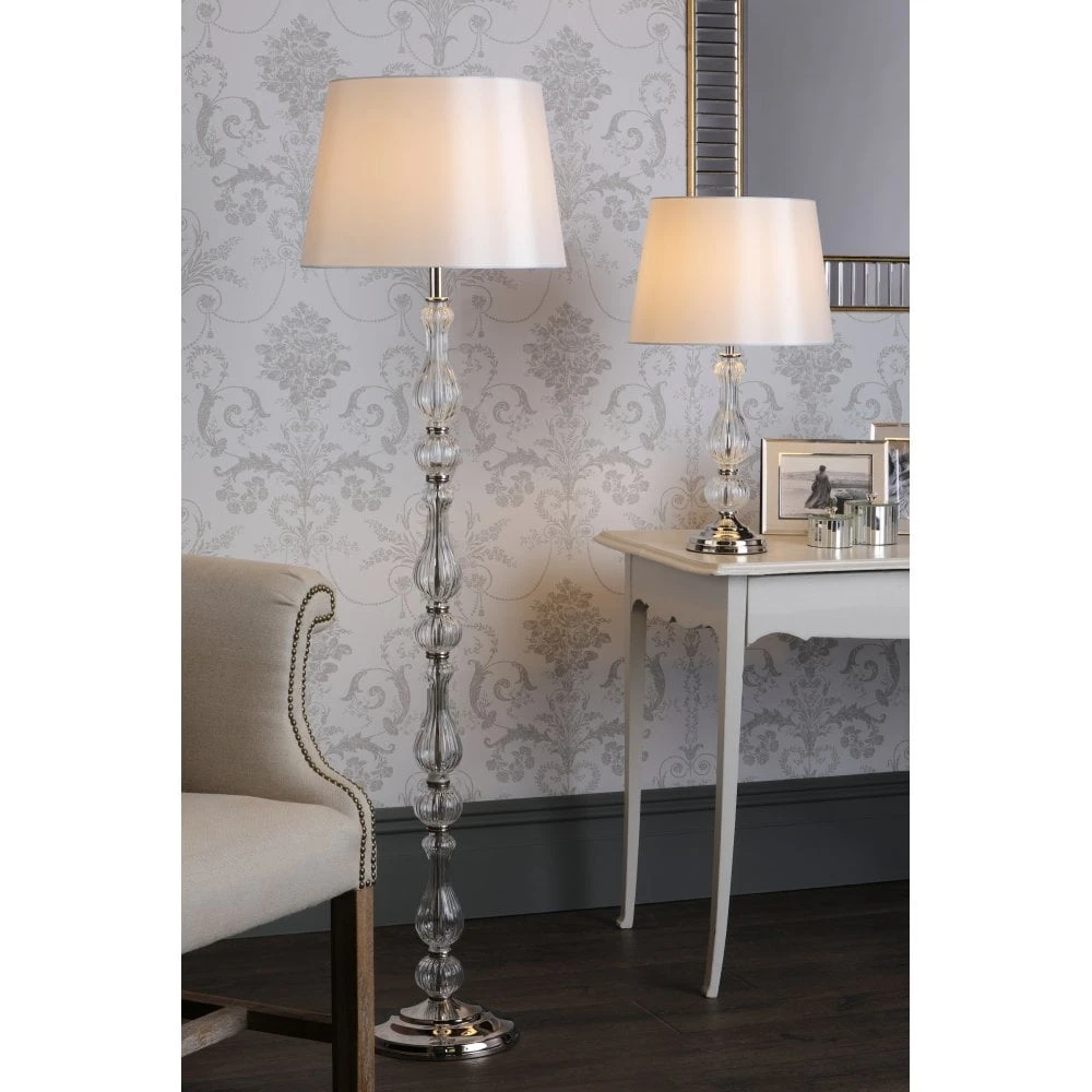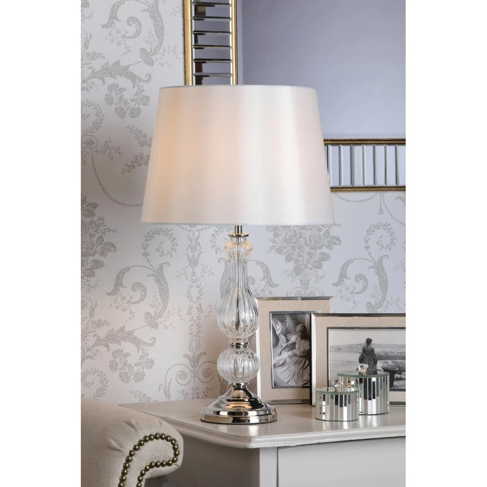 A polished nickel base supports the lamp and this finish runs through the glass to the lampholder where there is a push bar switch. In perfect harmony, the cool, pale grey tapered drum lampshade in faux silk completes the look.