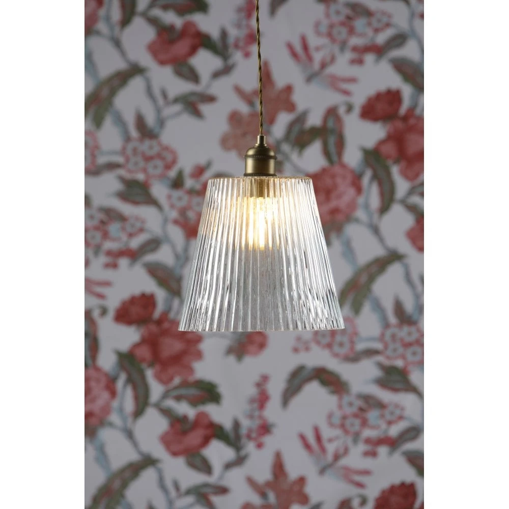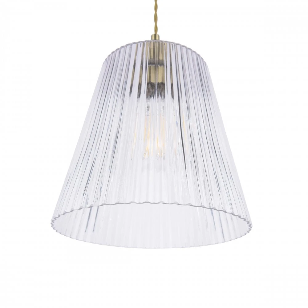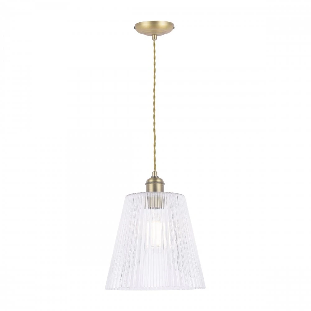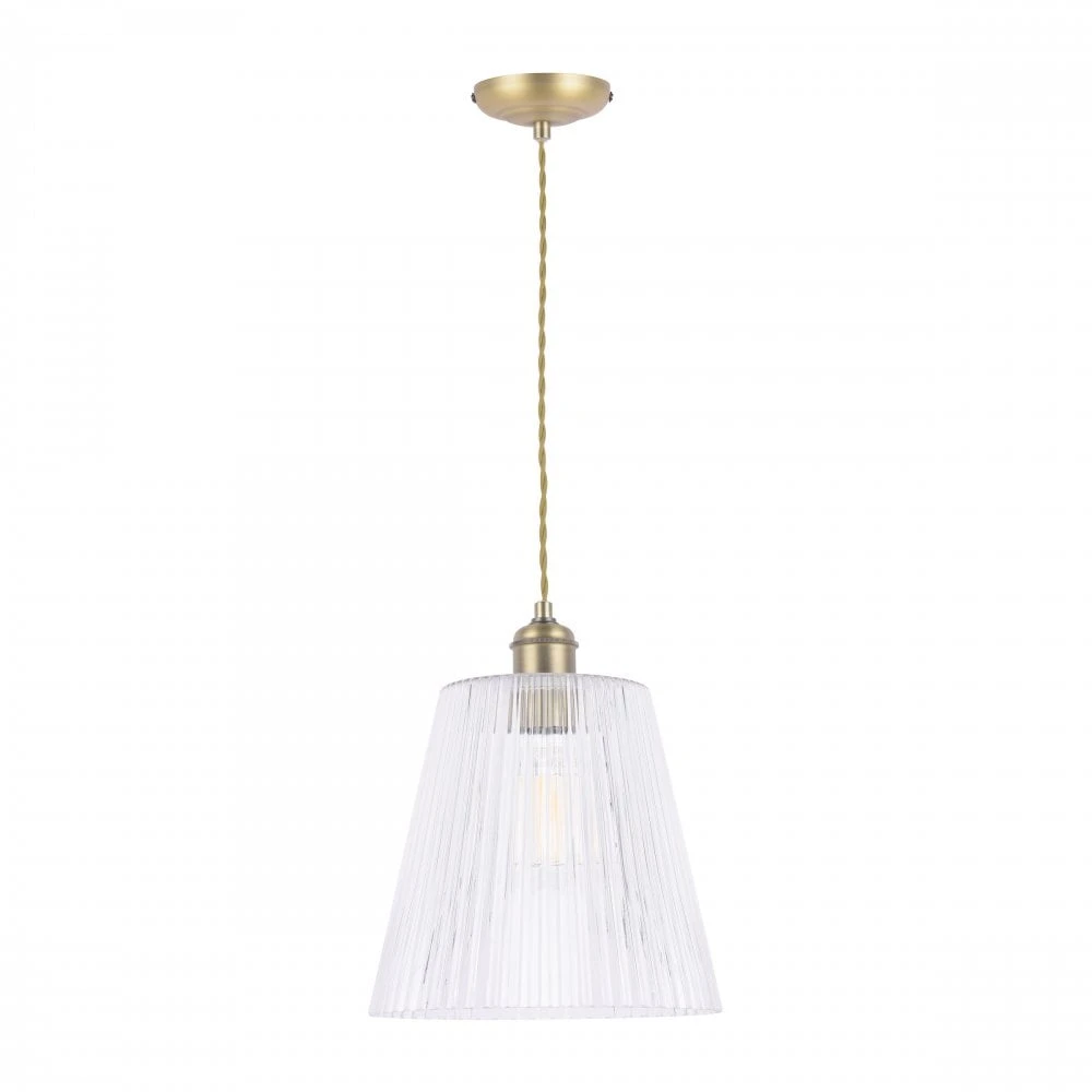 A modern ceiling pendant with a soft, antiqued brass finish with a ribbed glass shade. The tapered glass shades features a linear ribbed texture which helps to prevent glare from the bulb and adds a little sparkle.