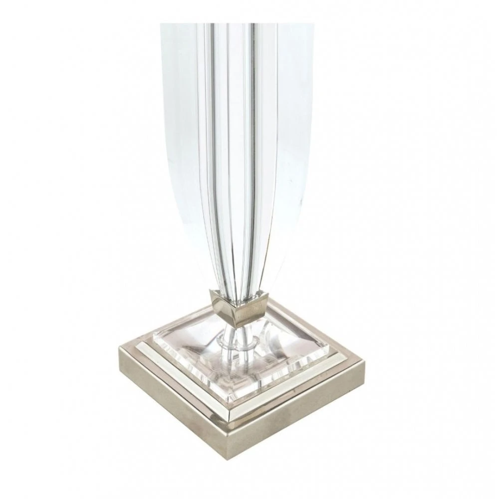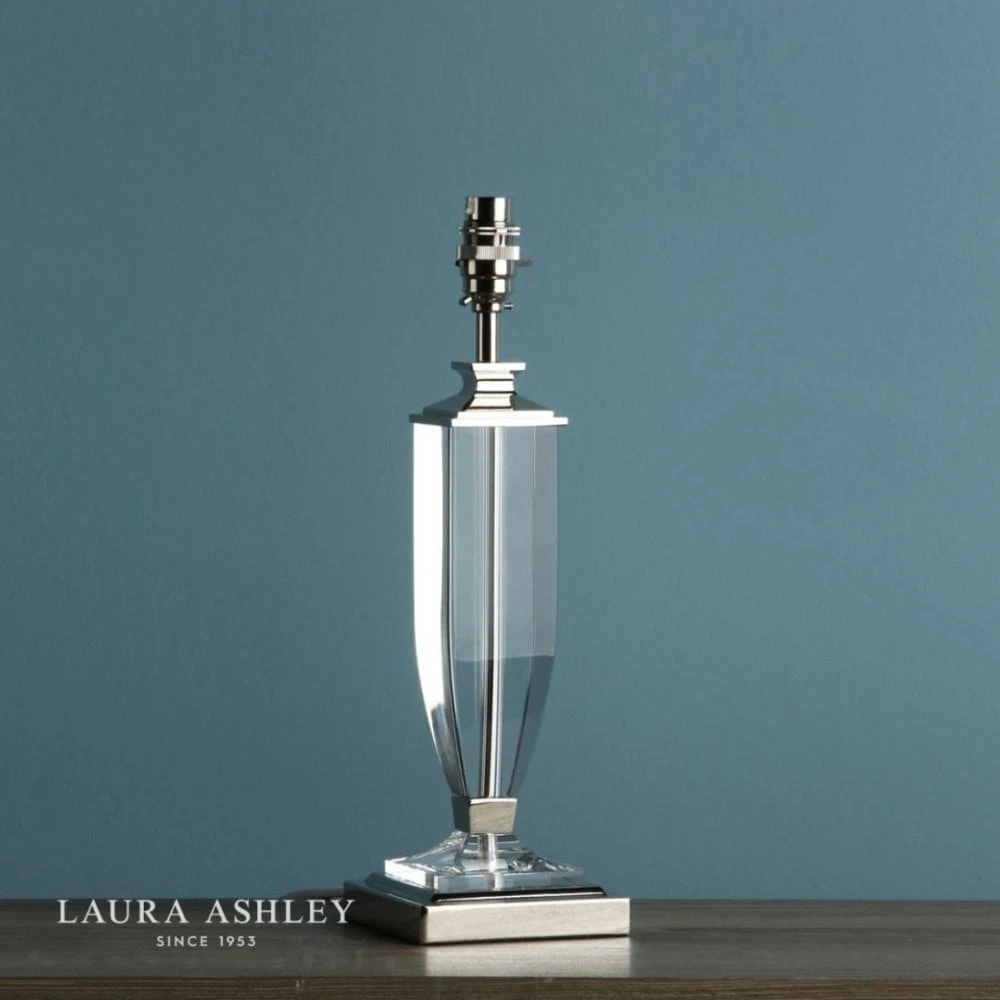 The Laura Ashley Carson table lamp is a rather grand statement table lamp with a clear, cut crystal body, hand polished to give a smooth surface. The metal base supports the column-shaped body, which is reminiscent of the shape of a slender classical vase. This stylish table lamp has an polished nickel finish.Â