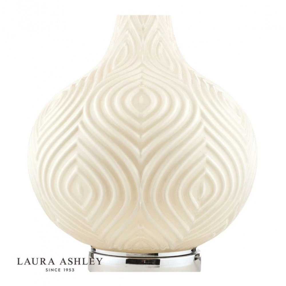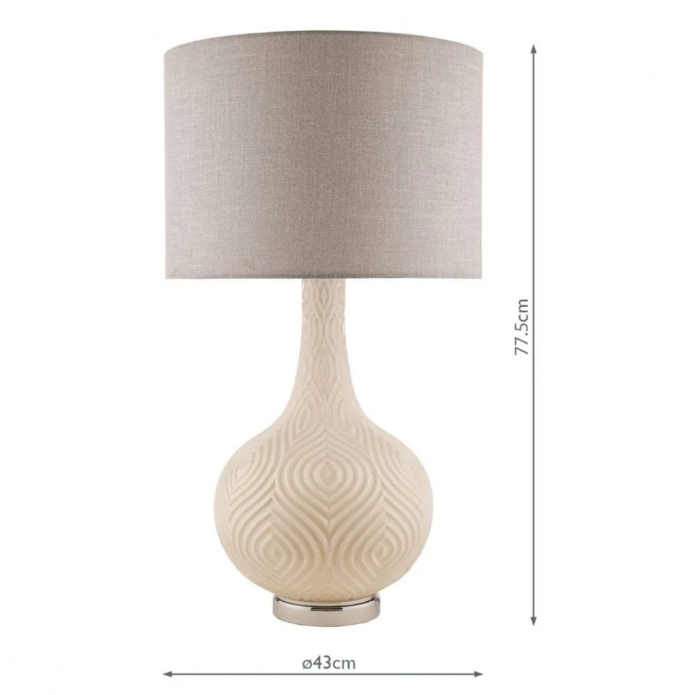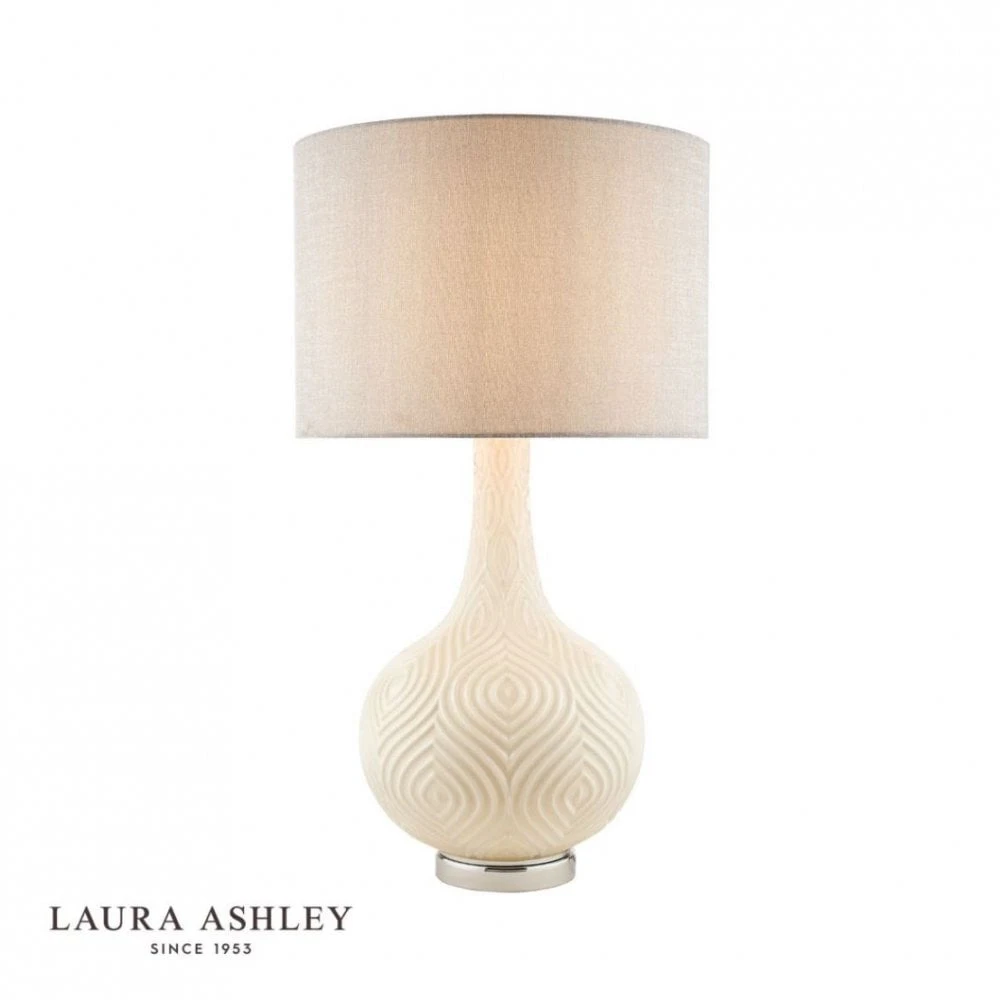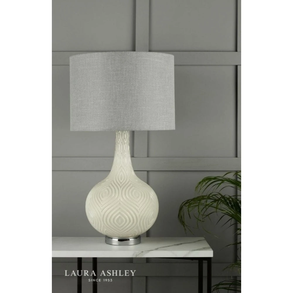 A delightful large table lamp, the bottle-shaped Grace from Laura Ashley has the look of opal glass (also known as milk glass), as the raised, ogee-patterned surface has been painted white. This lovely table light is accompanied by a grey linen cylinder shade and finished with bright polished nickel metalwork, including the round ring the base sits on. This table lamp has a grey braided cable with a convenient in-line rocker switch.