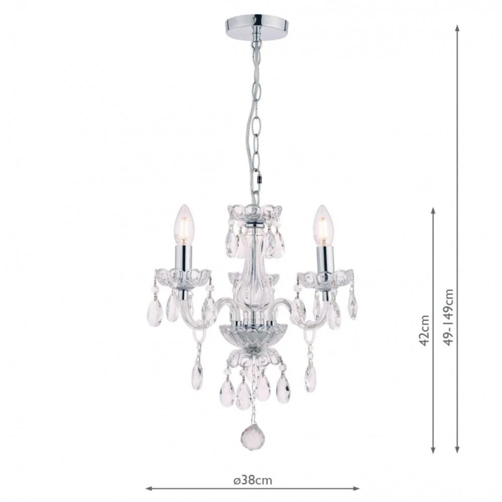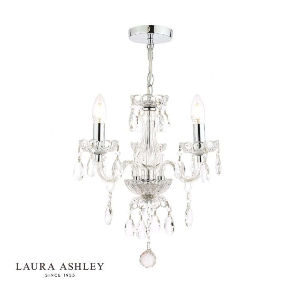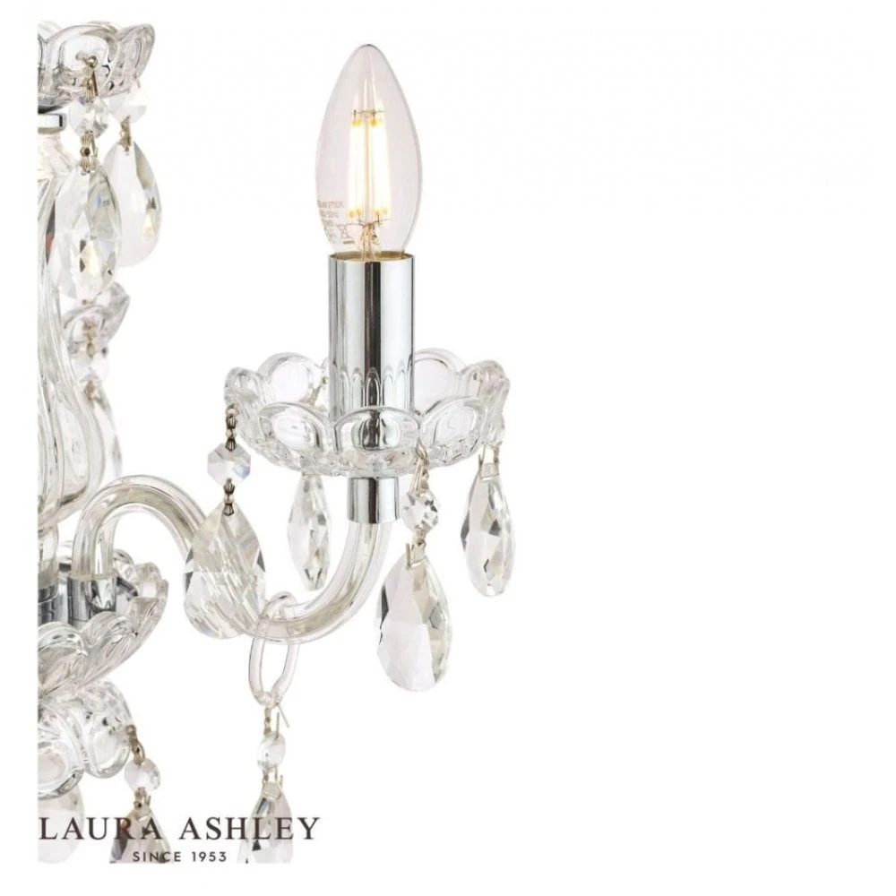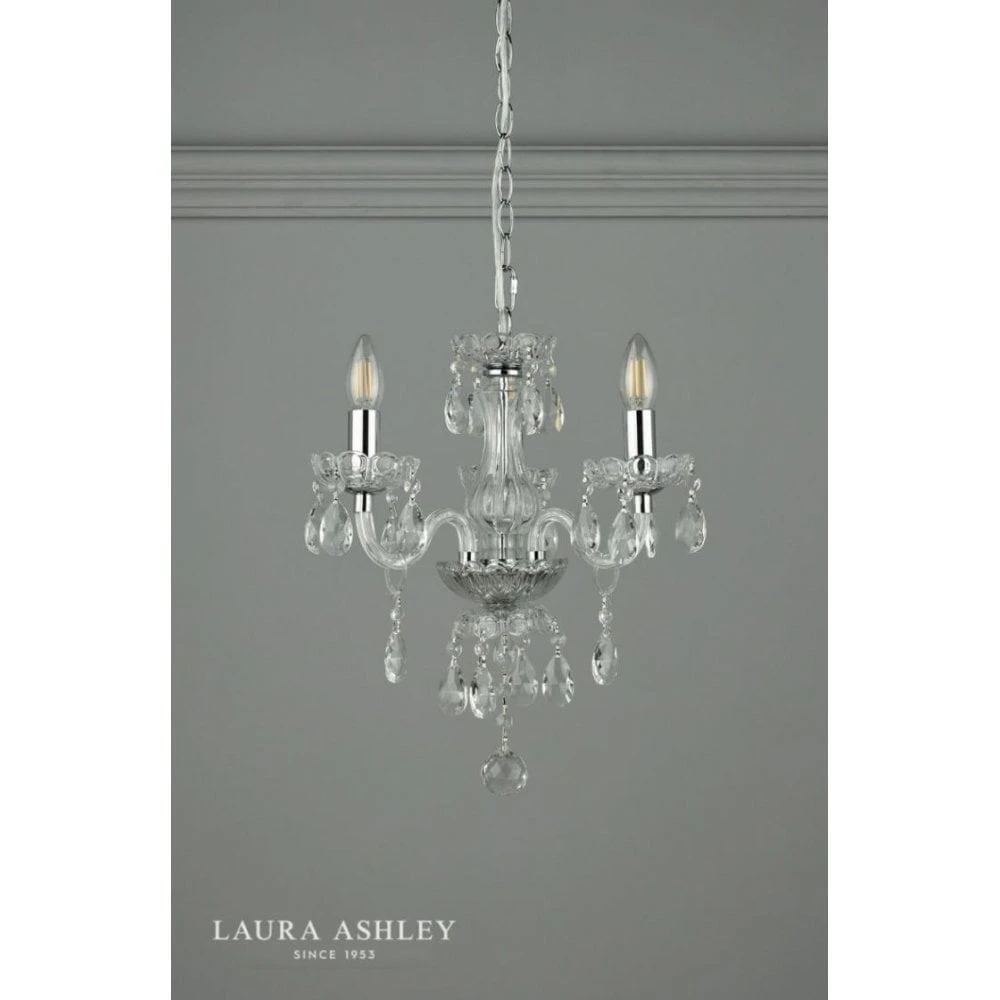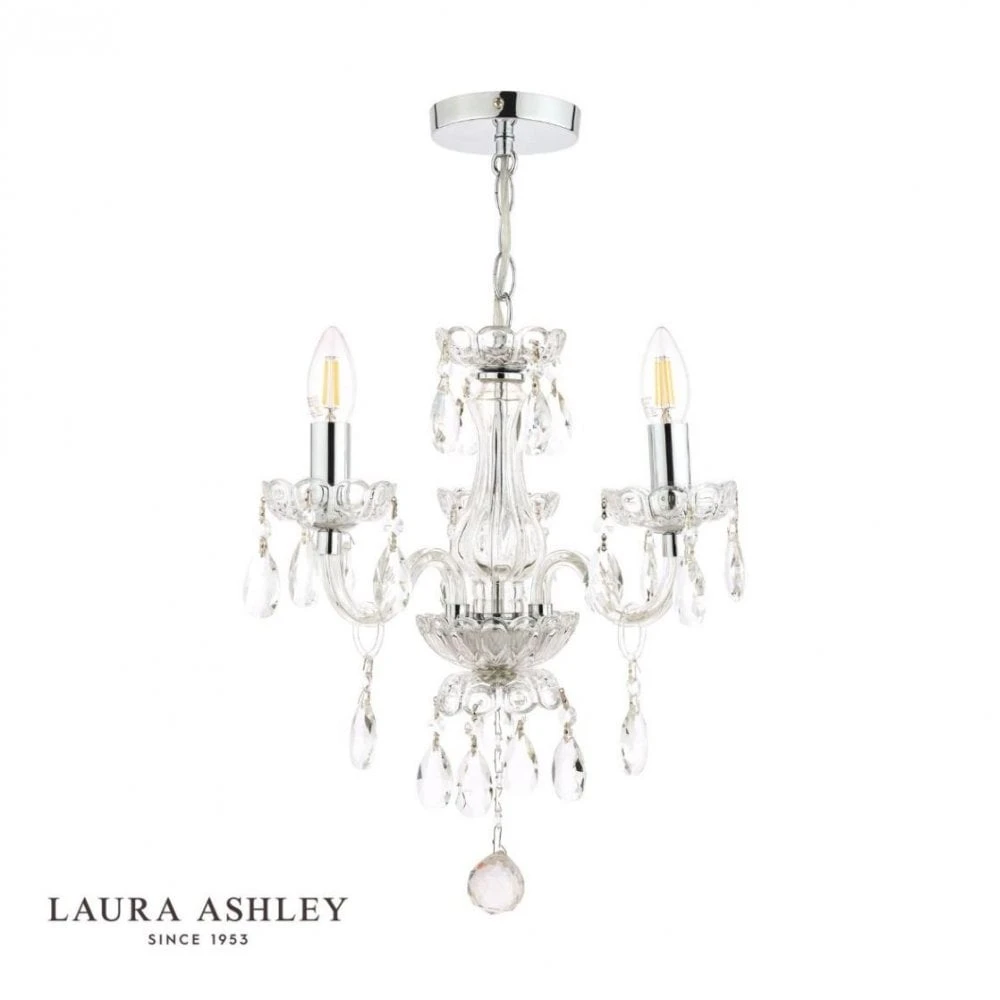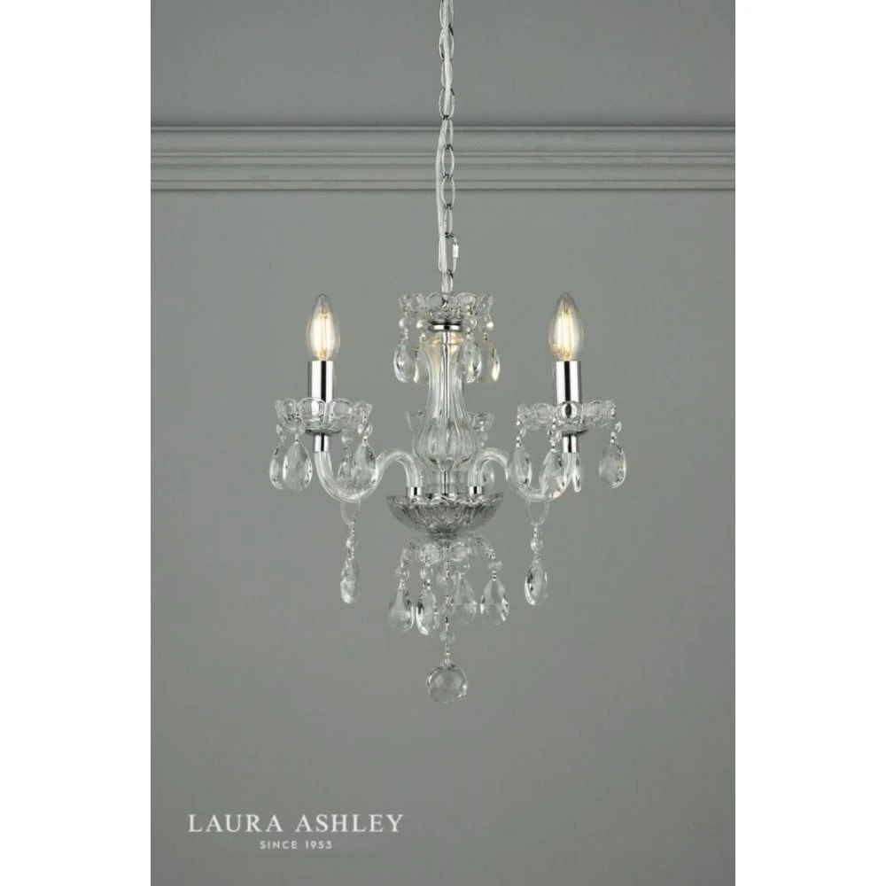 Positively dripping with light-refracting faceted crystal almonds, this chandelier from Laura Ashley has 3 lights on curved crystal arms. This armed ceiling fitting has a polished chrome finish. This chandelier has a matching finish ceiling rose and hanging chain plus a white cable. The height is adjustable during installation to suit a variety of ceiling heights.