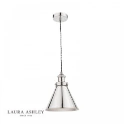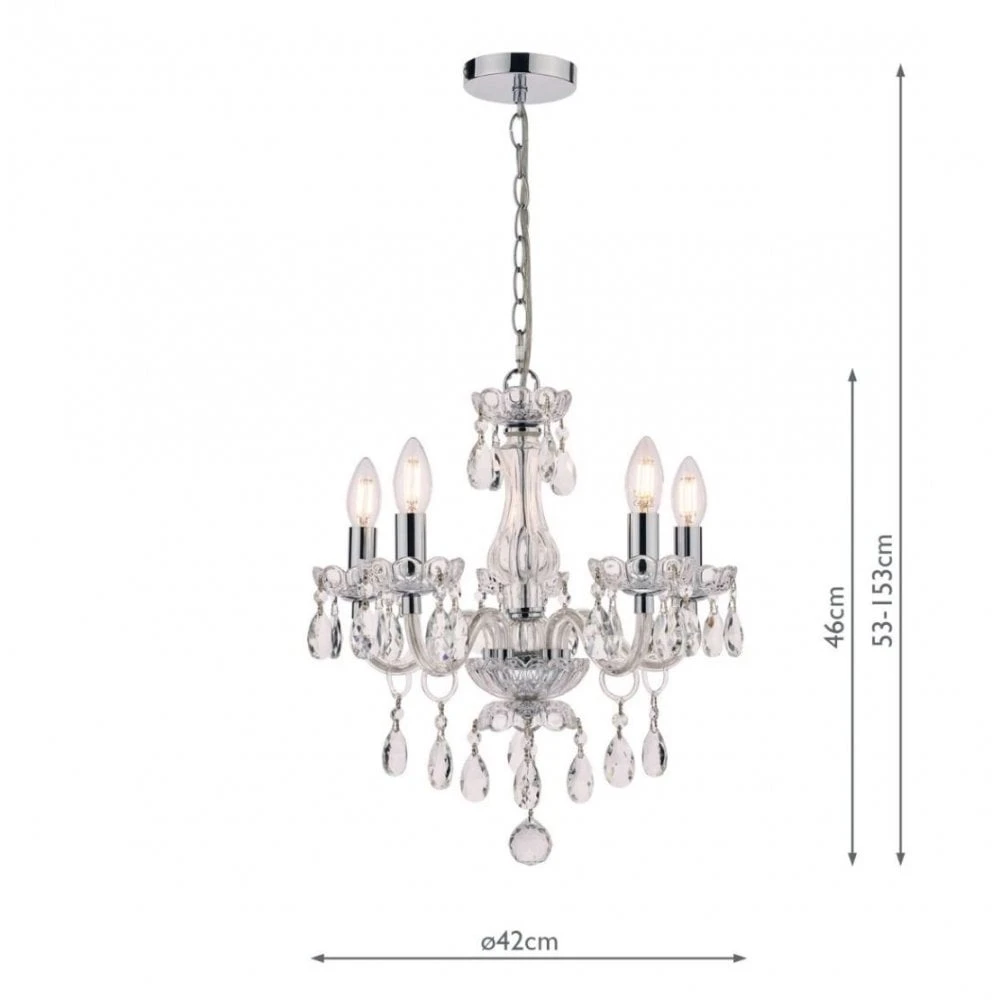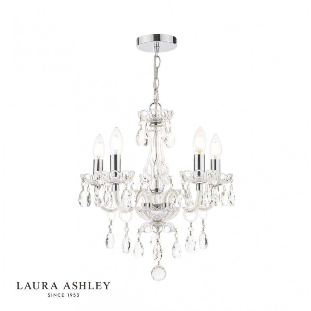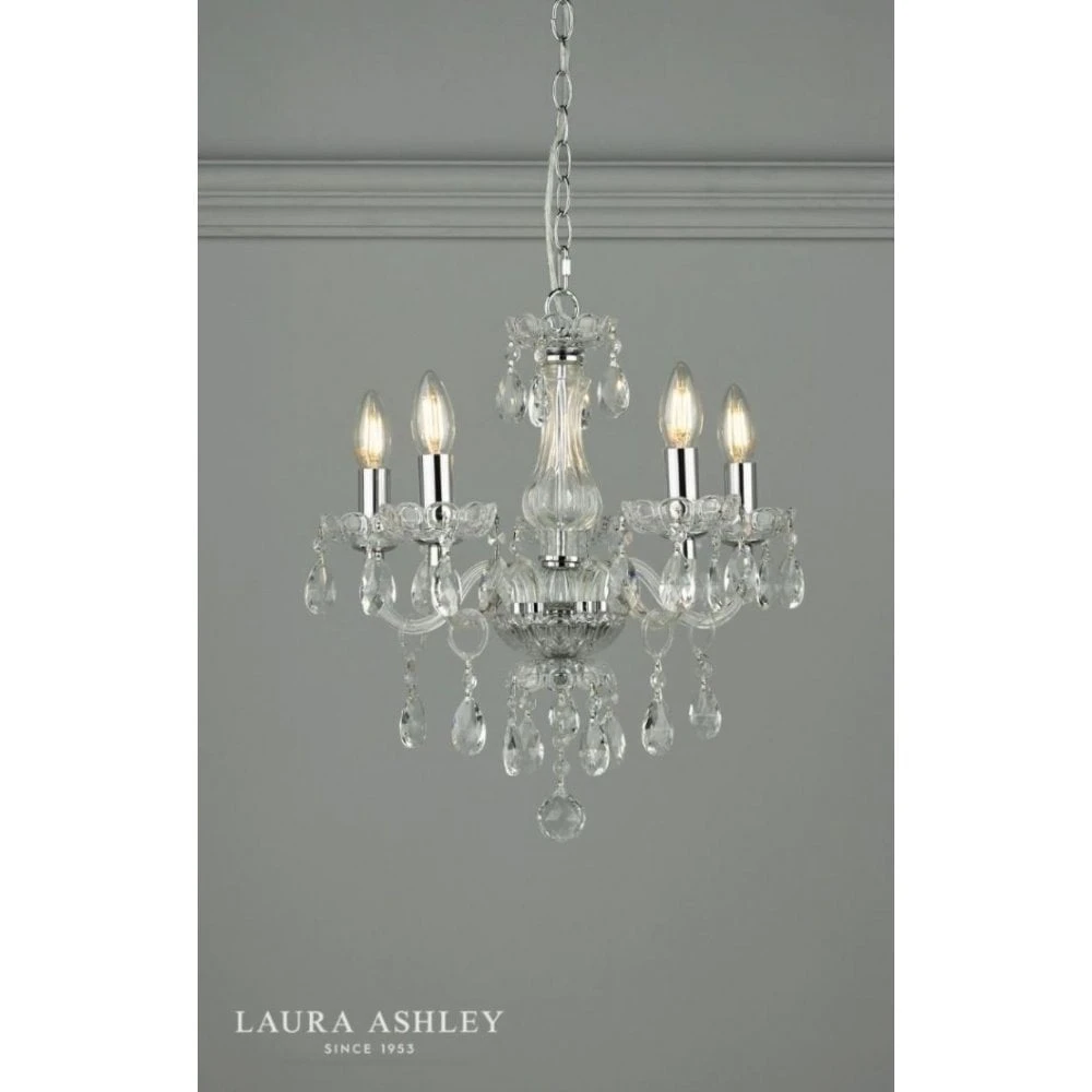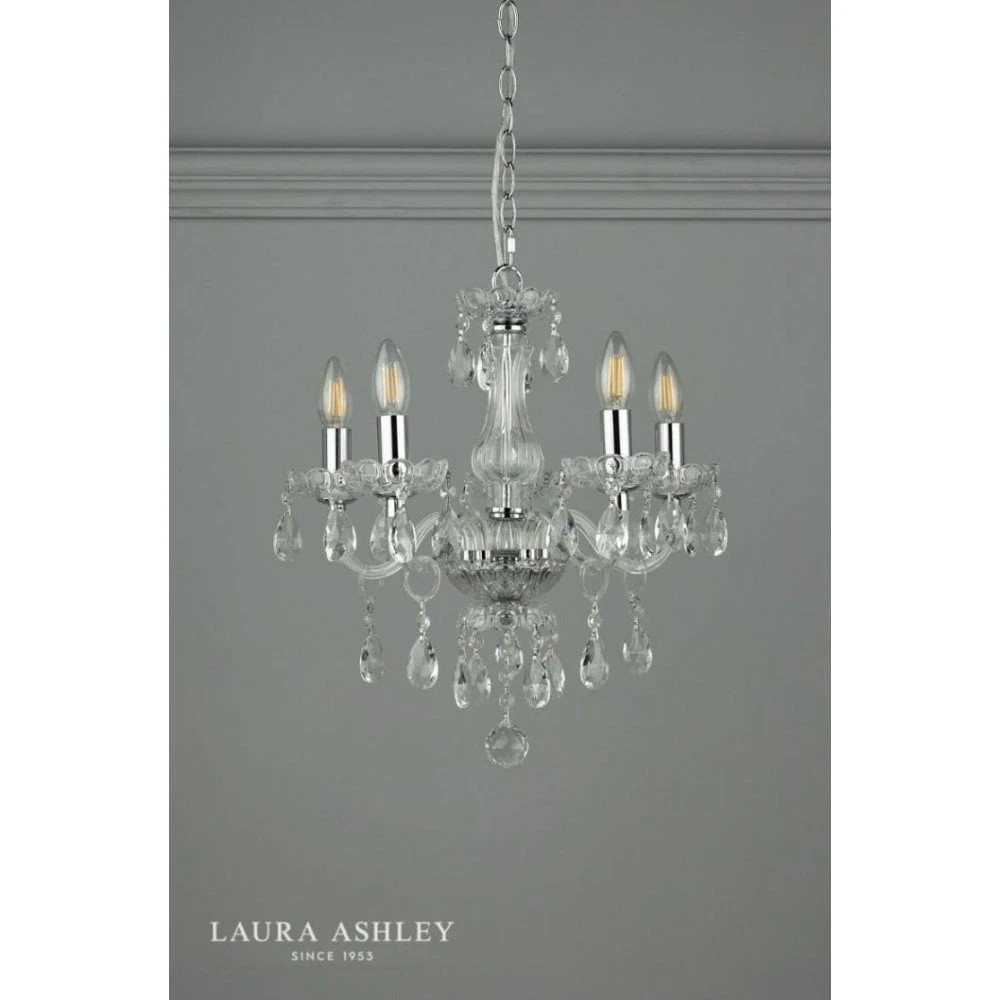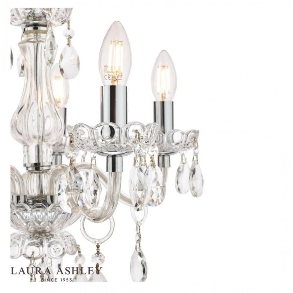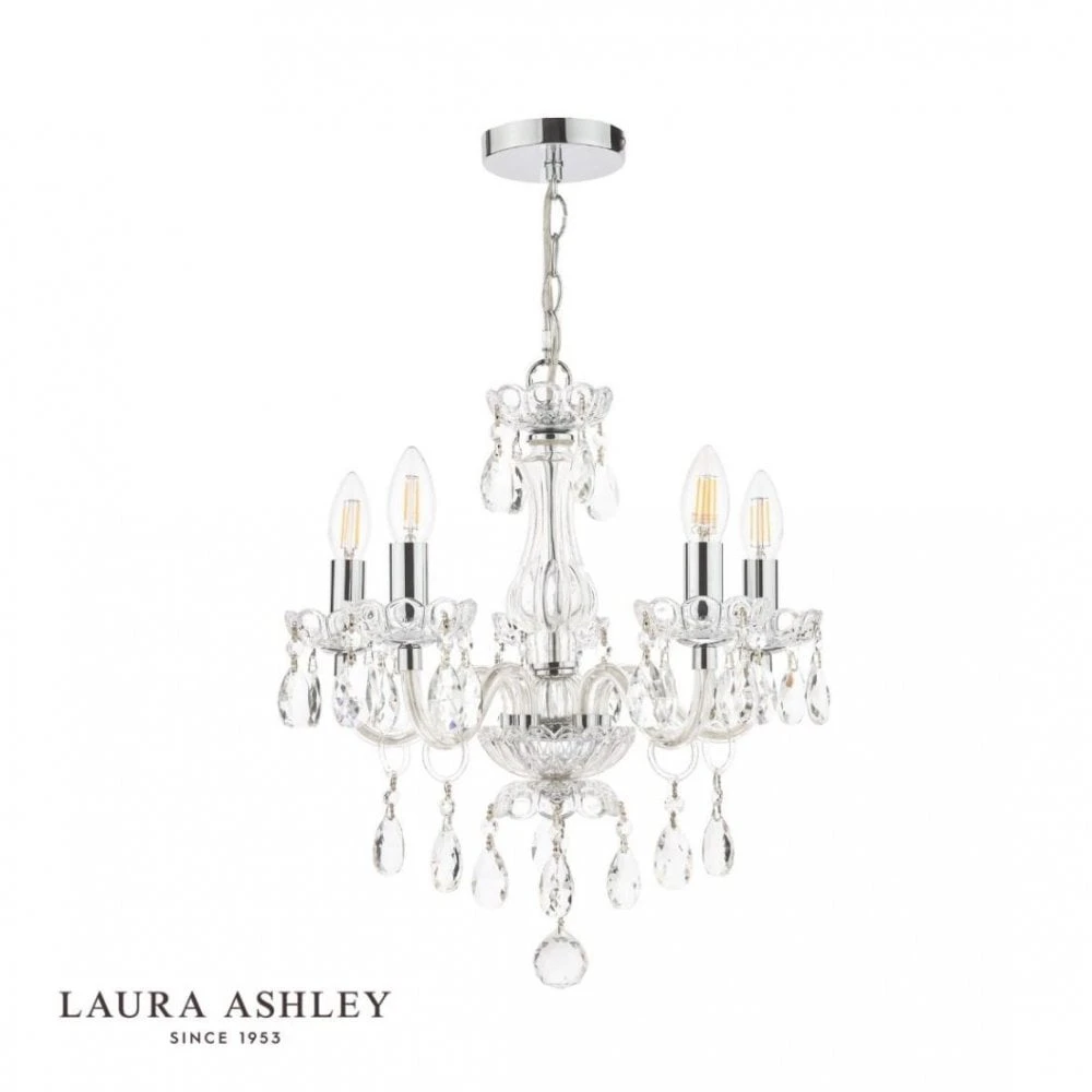 Positively dripping with light-refracting faceted crystal almonds, this chandelier from Laura Ashley has 5 lights on curved crystal arms. This armed ceiling fitting has a polished chrome finish. This chandelier has a matching finish ceiling rose and hanging chain plus a white cable. The height is adjustable during installation to suit a variety of ceiling heights.Â
