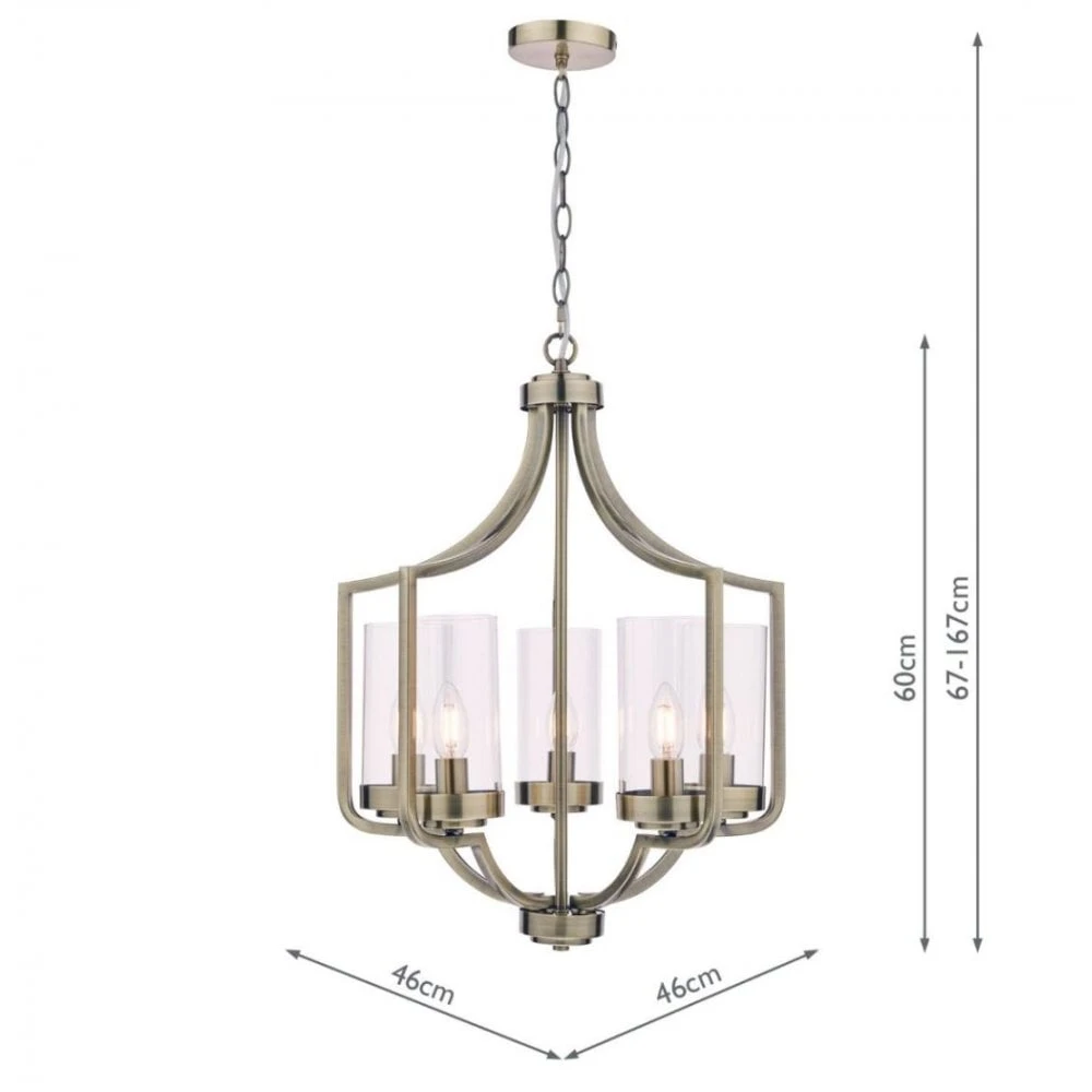 A beautiful chandelier in an antique brass finish with glass cylinder shades that provide an excellent display for decorative filament bulbs. This traditional inspired ceiling light features a stylish yet simply frame design with a matching antique brass chain and ceiling rose. This light can be height adjusted upon installation to suit most ceiling heights and can be dimmable when suitable bulbs and dimmer switches are used. This chandelier would look great above a dining table or in a living room.