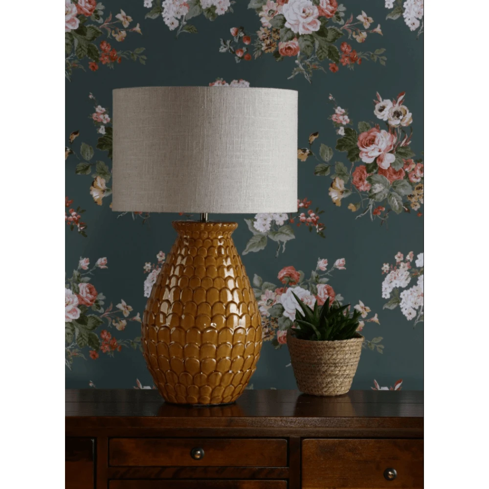 This table lamp, in a warm and brilliant ochre-orange with a natural linen drum shade, will satisfy your need to add a splash of vivid colour and strong texture to your living room this season.