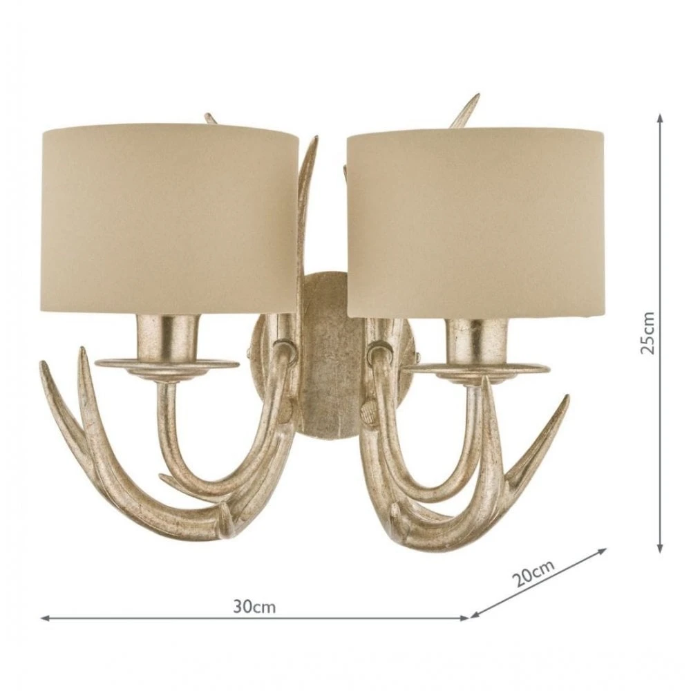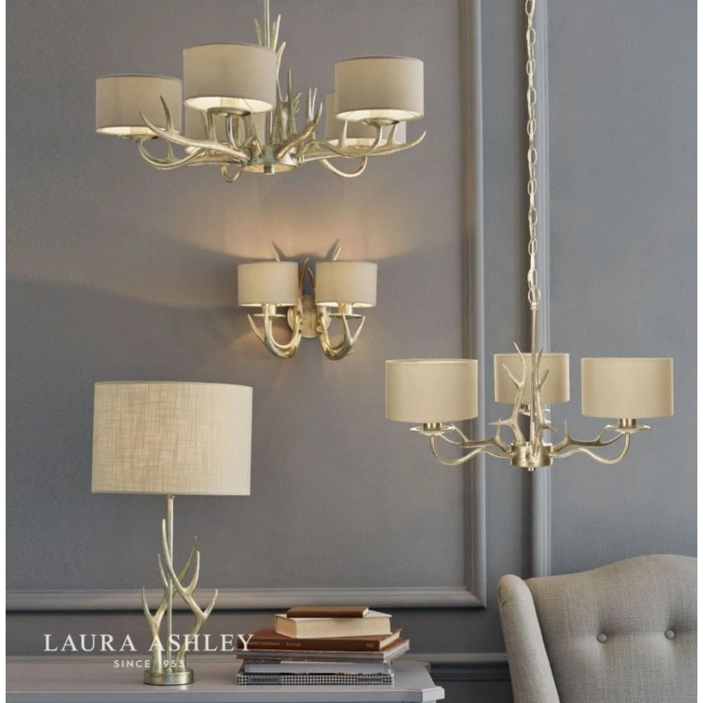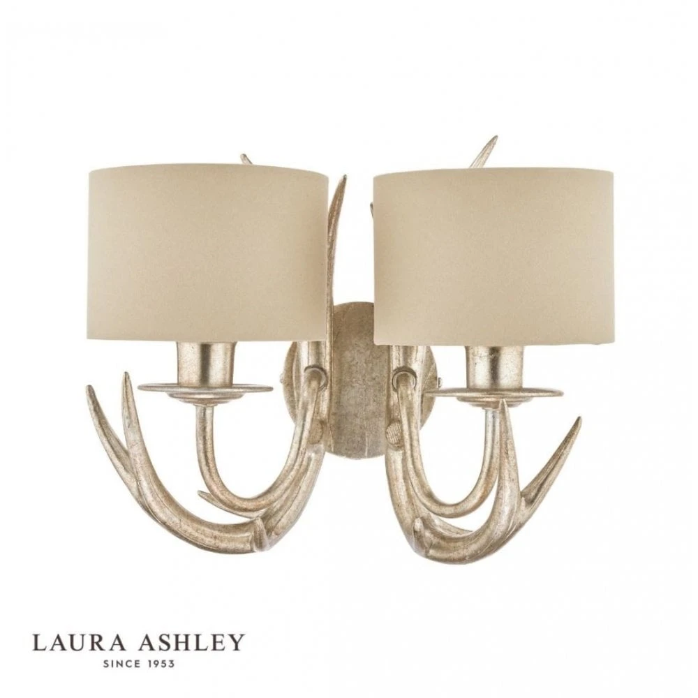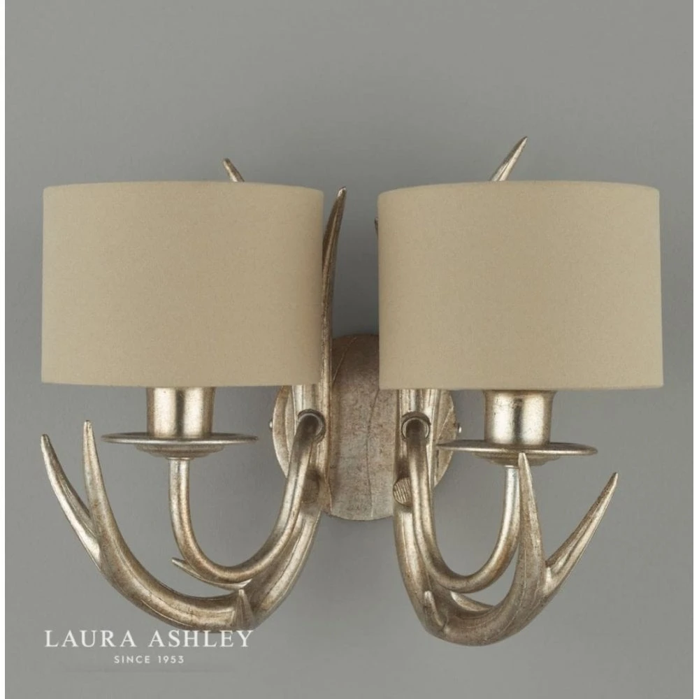 Add a touch of luxury to your home with this double wall light by Laura Ashley. This wall light displays two champagne gold antler lamp holders and a textured circle wall plate. This contemporary wall light would suit most modern settings and comes complete with two sheened natural shades.Â