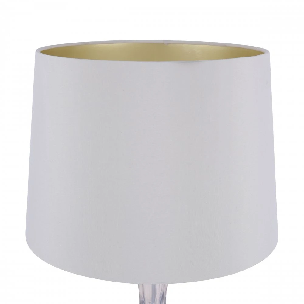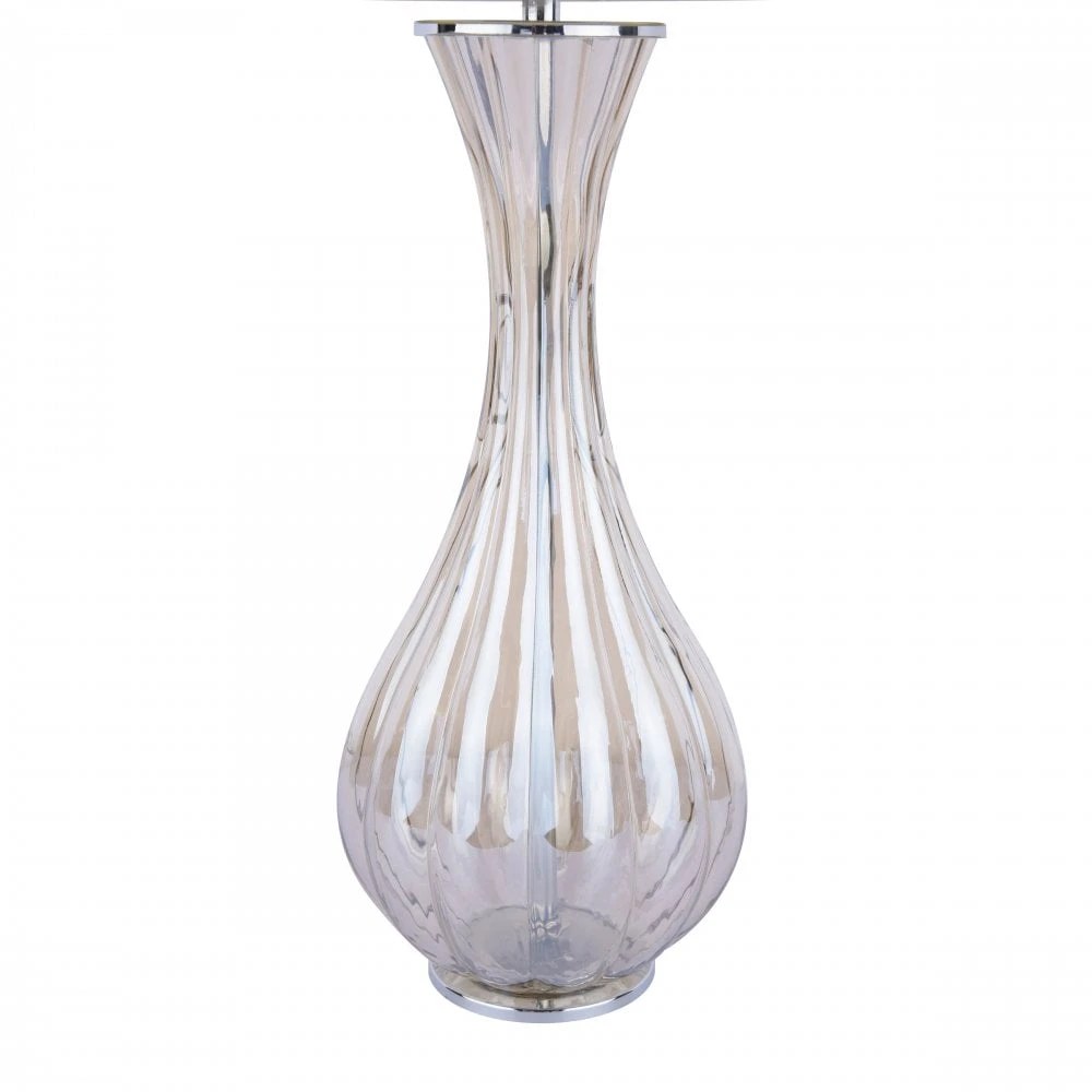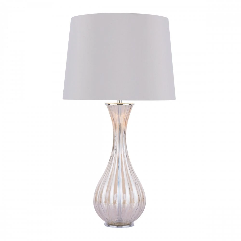 The Nevern table lamp by Laura Ashley features an electro plated ribbed glass in a luxurious champagne tone, paired with an ivory faux silk tapered drum shade with a glistening gold lining. The Nevern can be turned on use the in line rocker switch for easy convenient lighting.Â