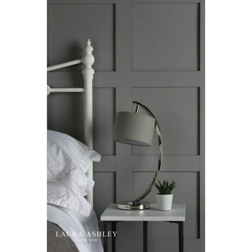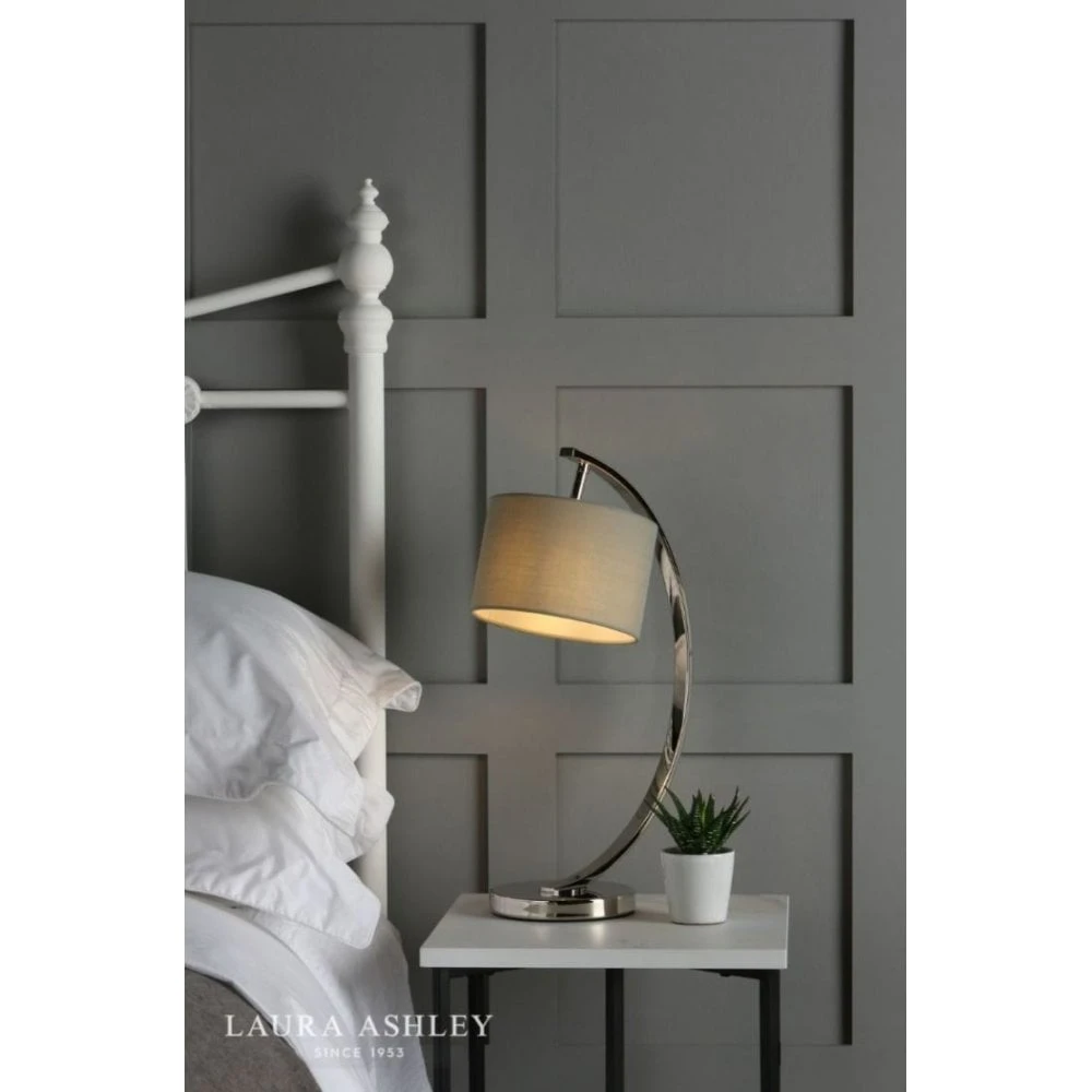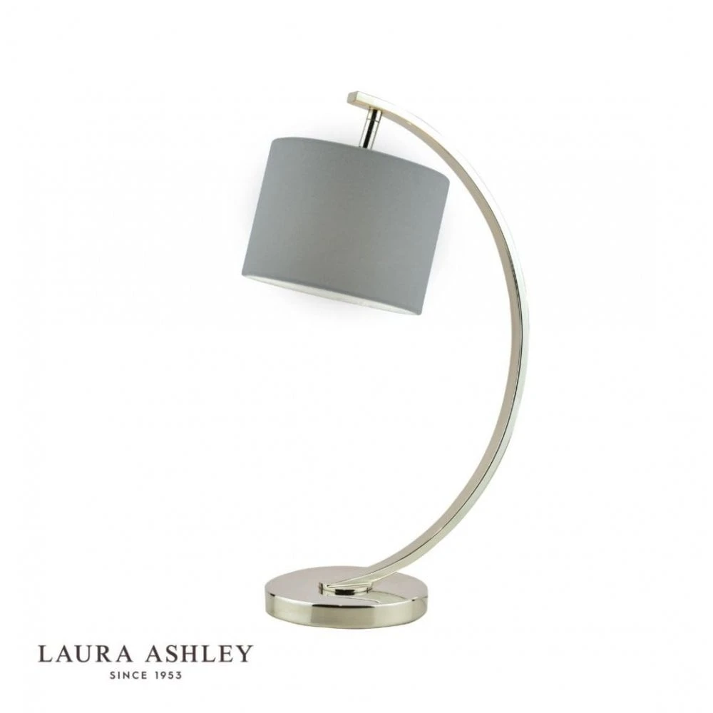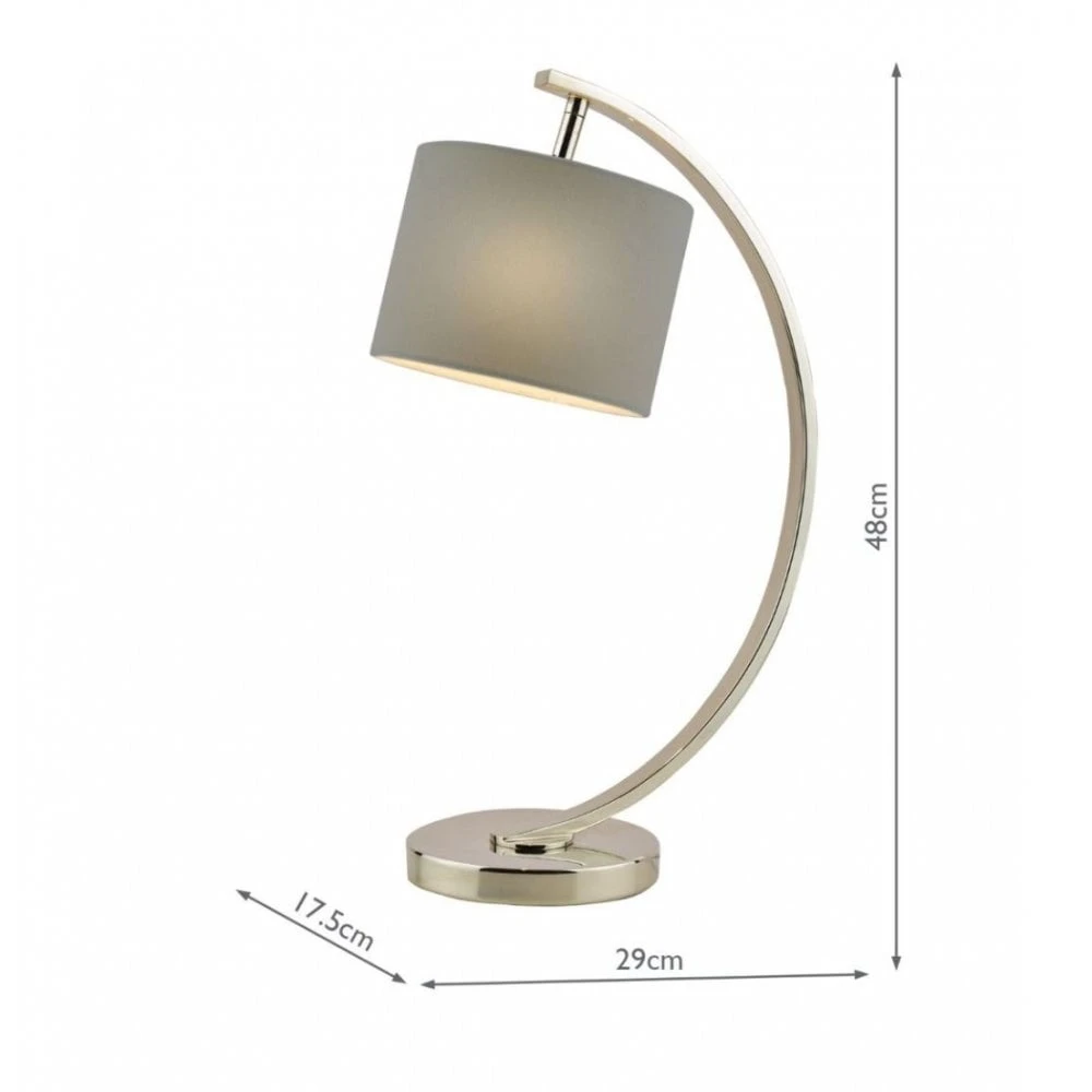 A stylish and modern curved table lamp in a luxury polished nickel finish with a smart and sophisticated grey drum shade. This table lamp would look perfect in a light and contemporary home office or on a bedside table. The sleek design works to enhance most contemporary schemes whilst adding a designer touch to any home.Â