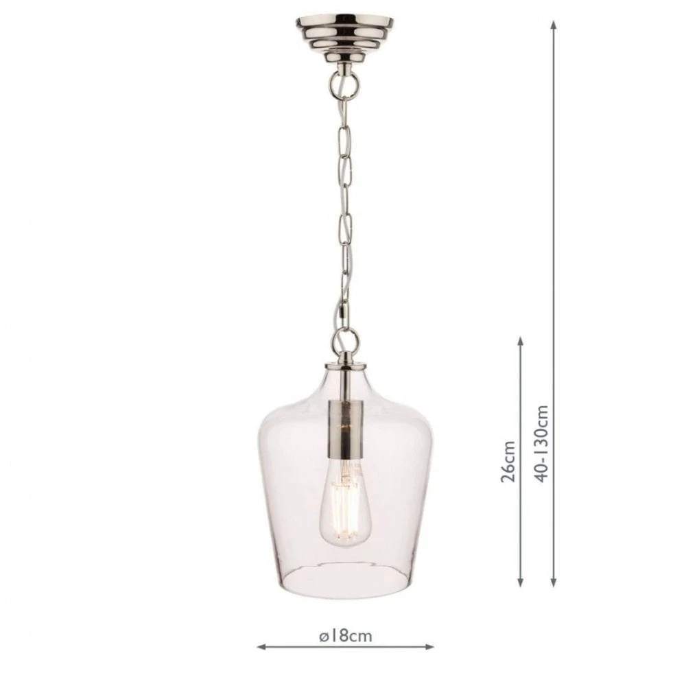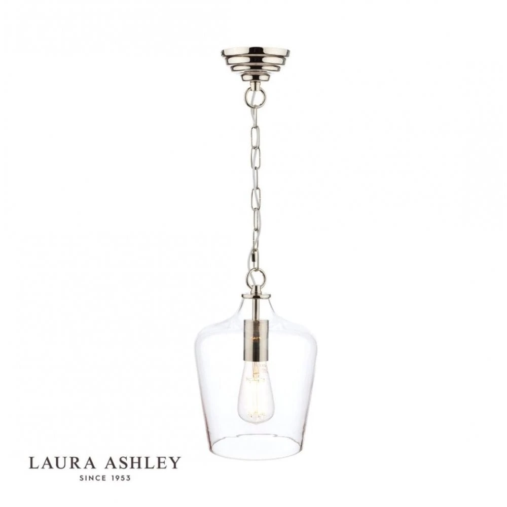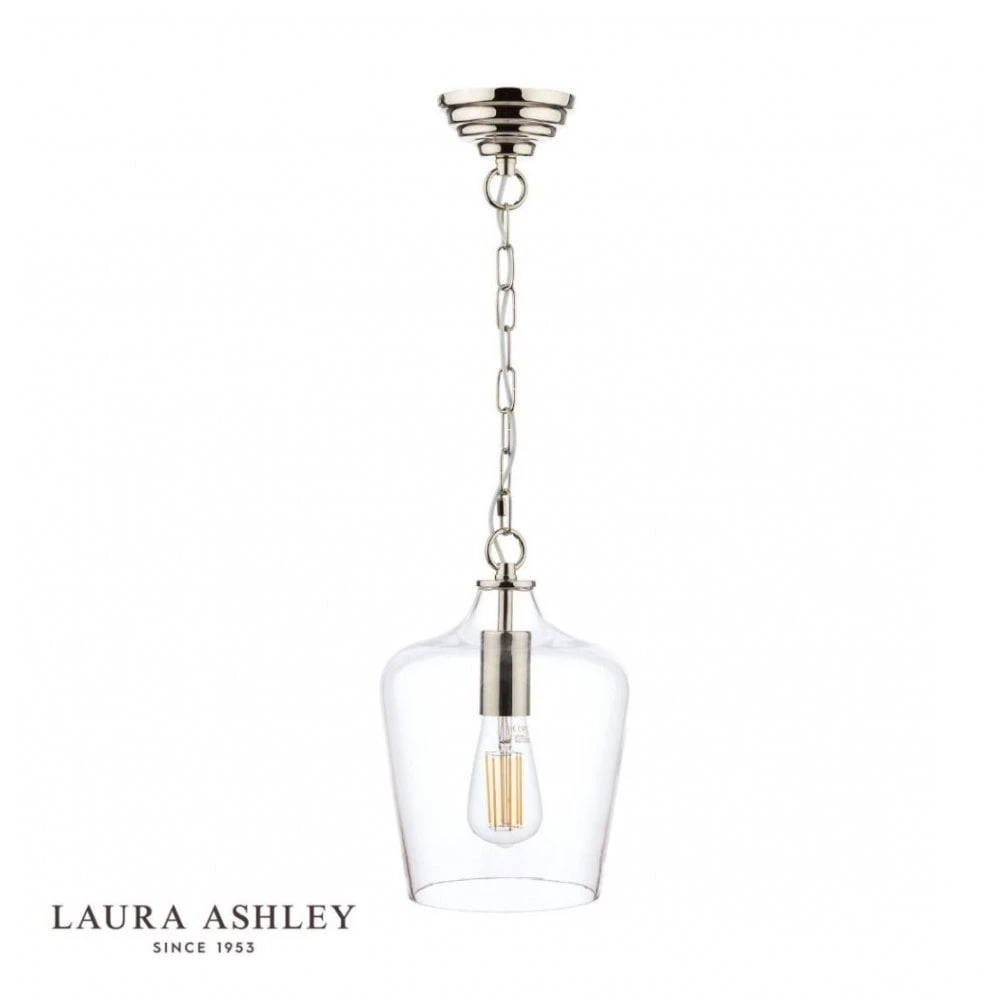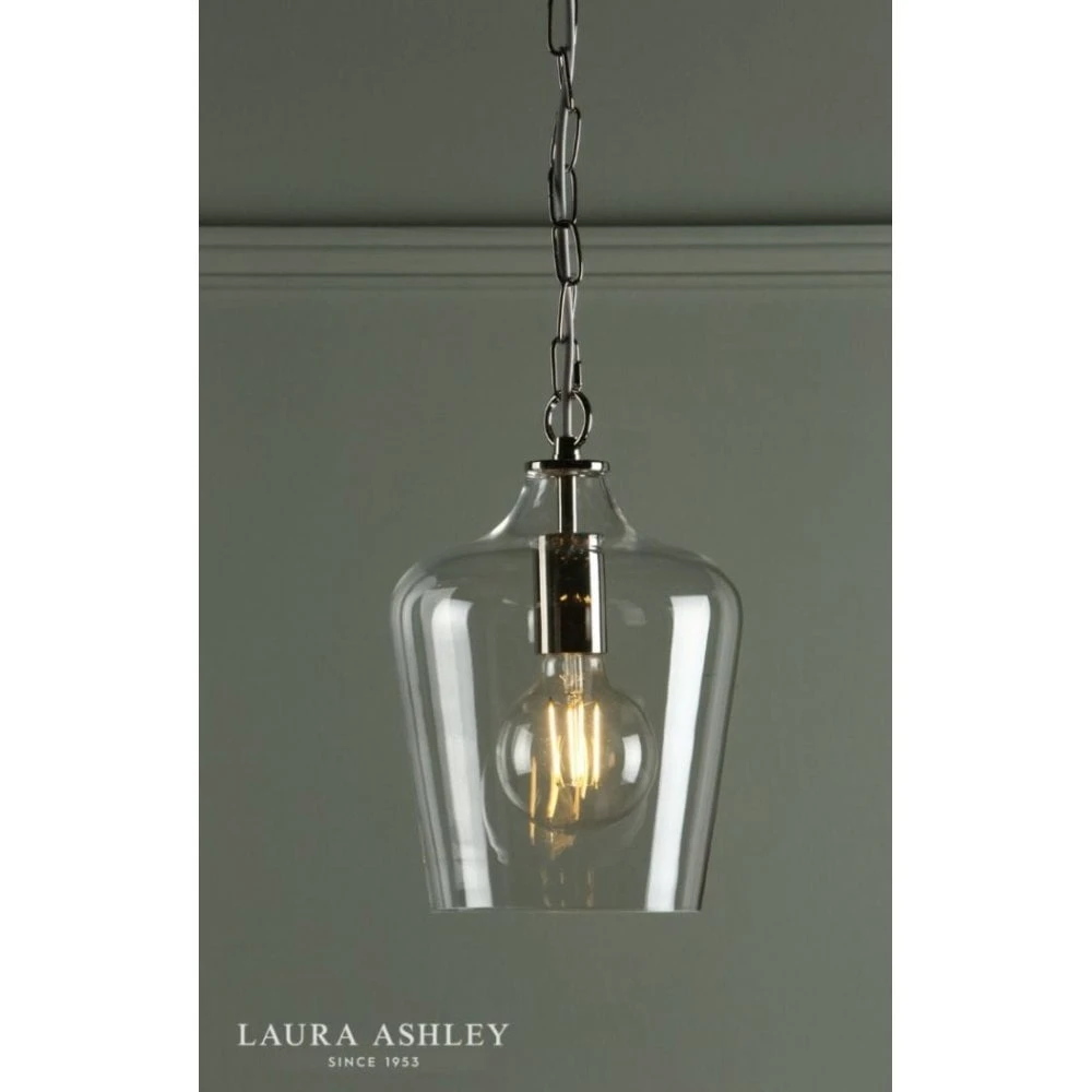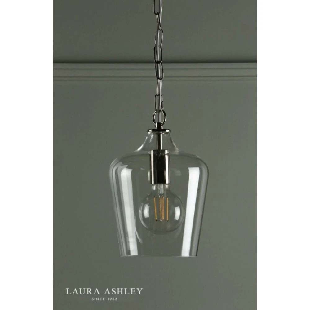 A small yet stylish ceiling pendant by Laura Ashley. The Ockley features a polished chrome frame with a slender clear glass shade for an opulent look. This ceiling pendant would suit almost any modern kitchen or dining area – above kitchen islands, breakfast bars and dining tables, on its own or as a part of a linear arrangement. This ceiling pendant can be height adjusted upon installation and is dimmable when paired with a suitable bulb and switch.