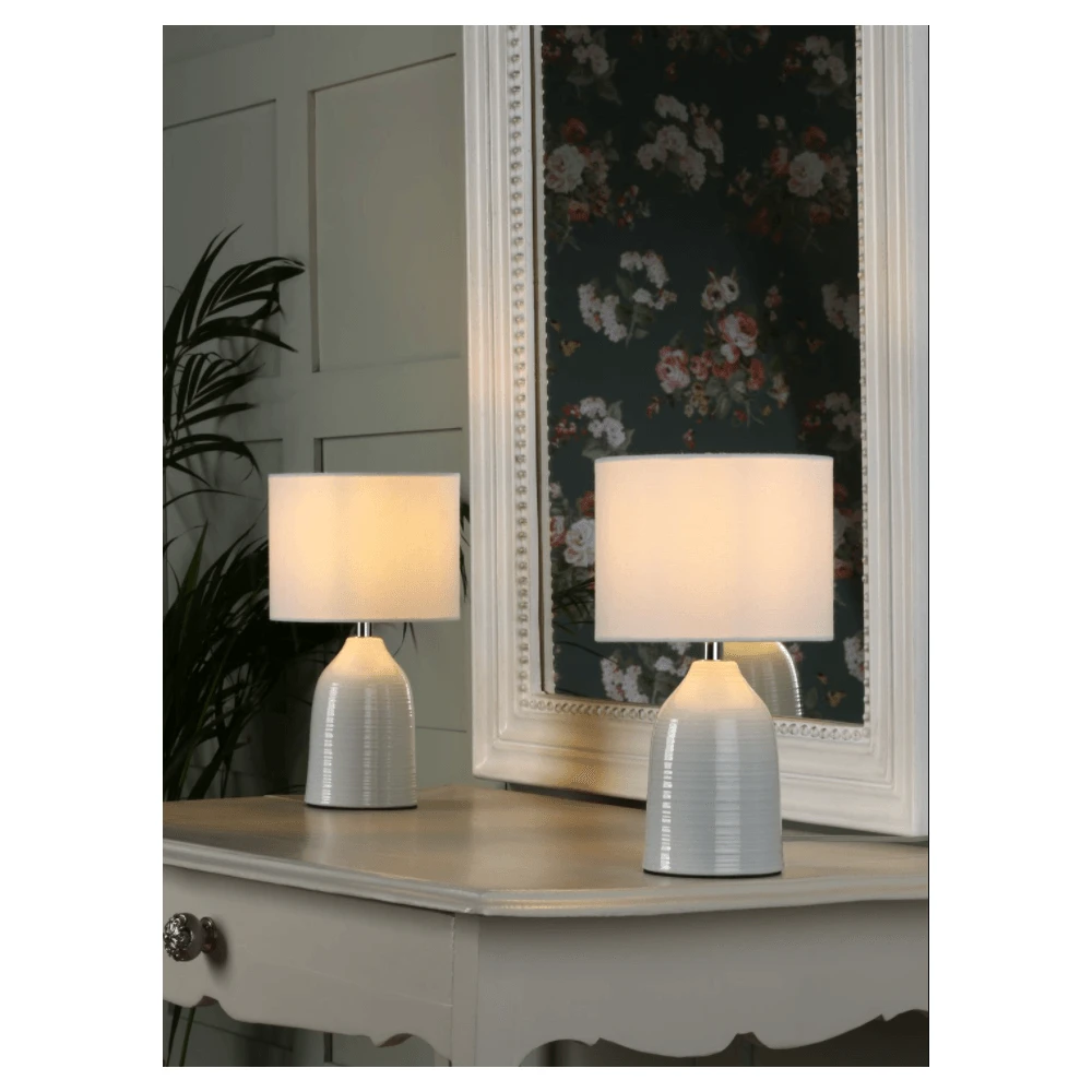 It’s important to remember that this is a Twin Pack (these table lamps are not available individually). Shades, as well as braided grey wires with an inbuilt switch, are included. Bulbs are not included; 1 40W B22 GLS bulb is required for each.