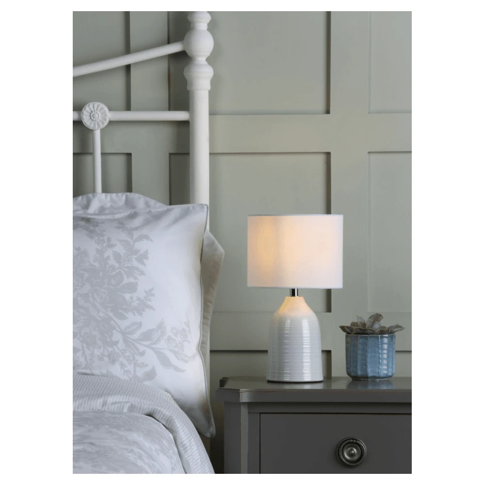 This wonderful set of little table lights would look great in a bedroom, on a long console, or on a dresser. Each is packaged in a traditional bottle with a neutral white linen tone. On the neutral grey-cream glaze, the crackle glaze effect is rather modest. Hand-carved horizontal ribbing distinguishes these tactile lights, which are sure to find a home in your home.