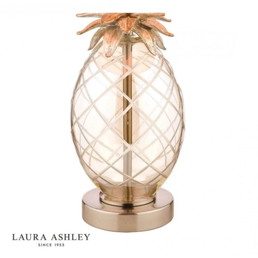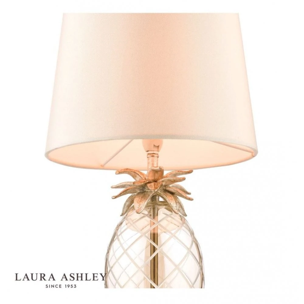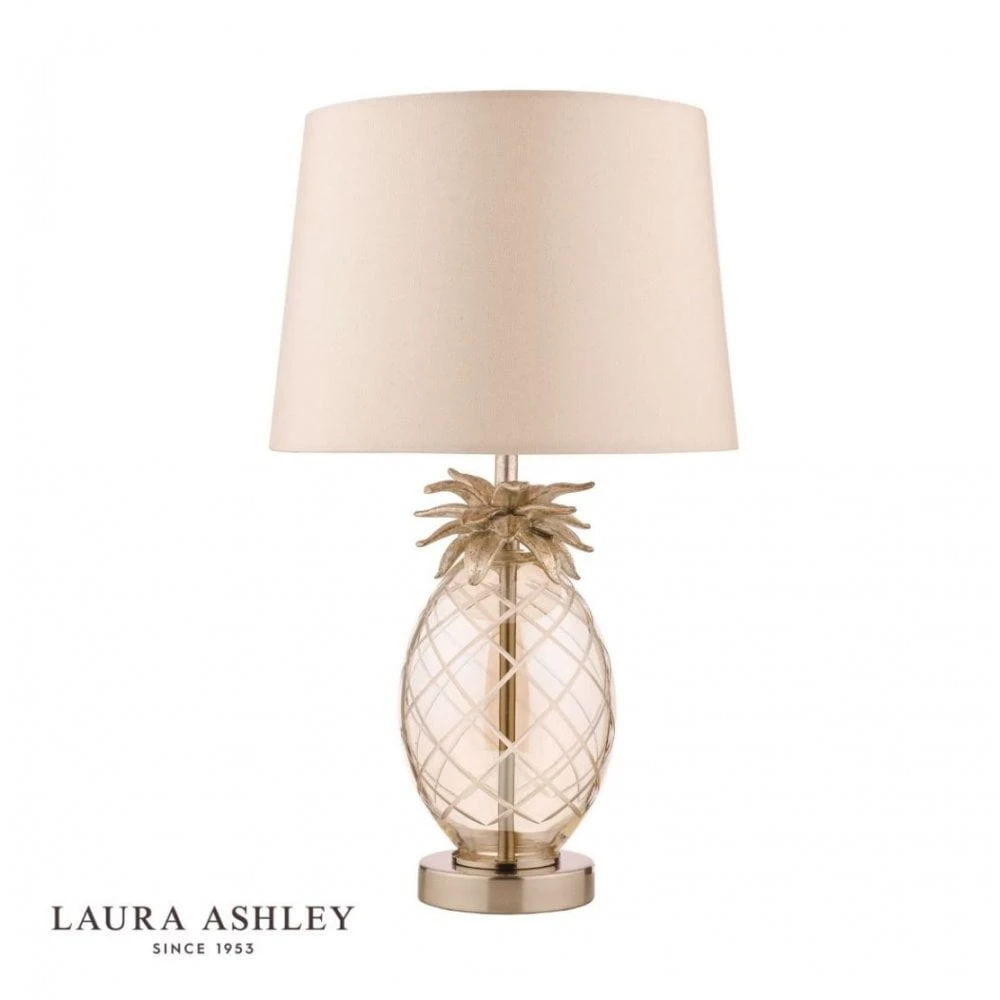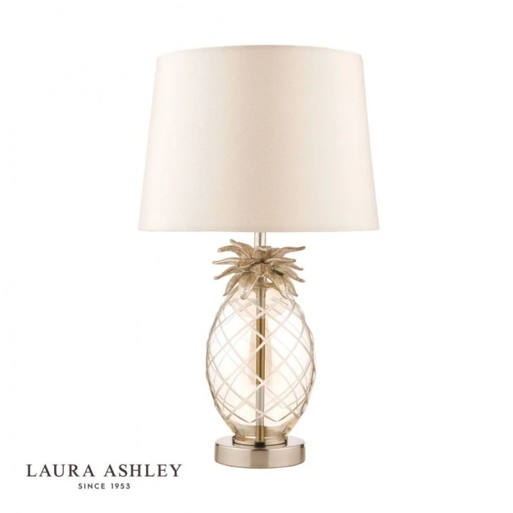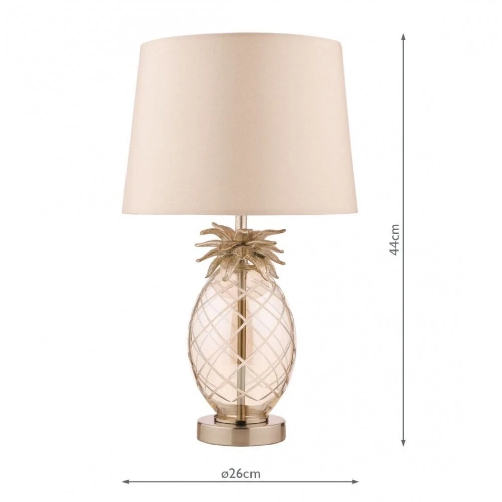 Add some real character to your home with this quirky table lamp featuring a glass pineapple base and taupe shade. Sitting atop a champagne gold ring, the pineapple shaped base is formed from champagne tinted, hand cut class and is topped with resin pineapple leaves. A matching bar runs through the glass base to a glamorous taupe faux silk shade to complete the luxury look.Â