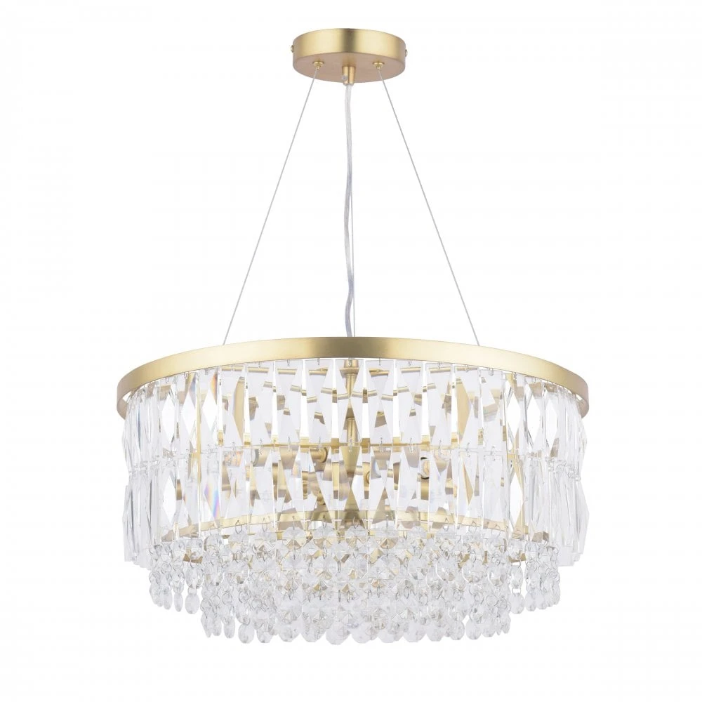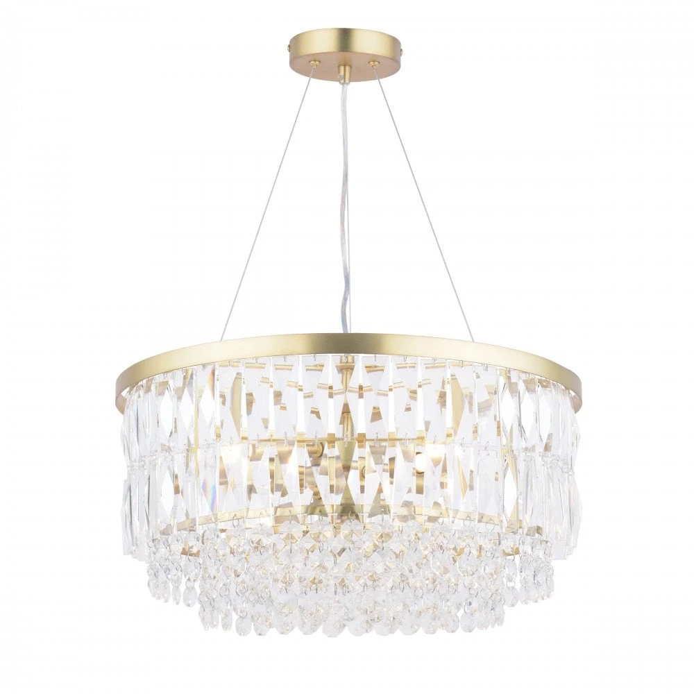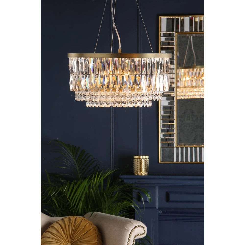 A brass and glass drum ceiling pendant which excudes luxury. Softly matt antique brass contrasts with the sharply faceted glass drops. There are two tiers of glass, the upper tier being baguette cut with pyramid faceting and the drops underneath are button shaped with a hexagonal facet.