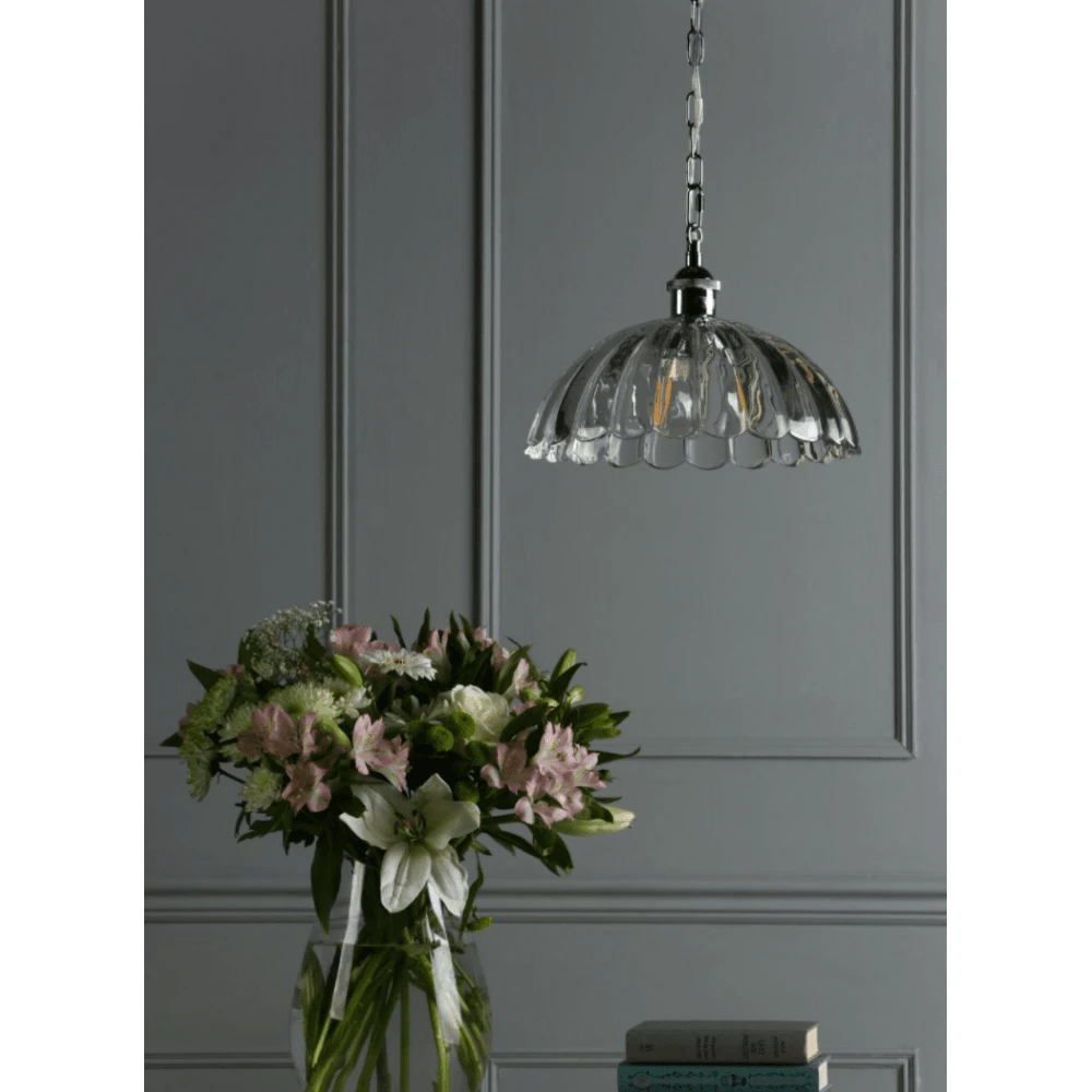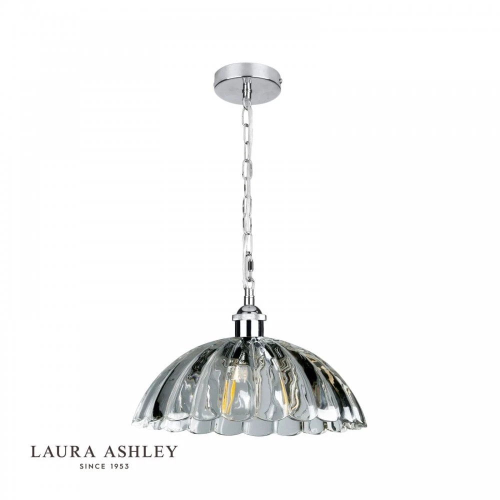 This classic ceiling light from Laura Ashley in neutral glass and polished chrome will look great in any environment. A shallow dome of sparkling, thick transparent glass with a softly textured fluted top and scalloped edge.