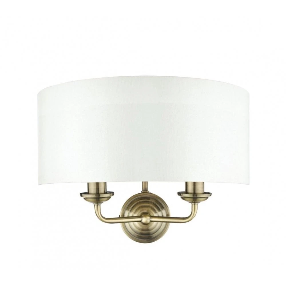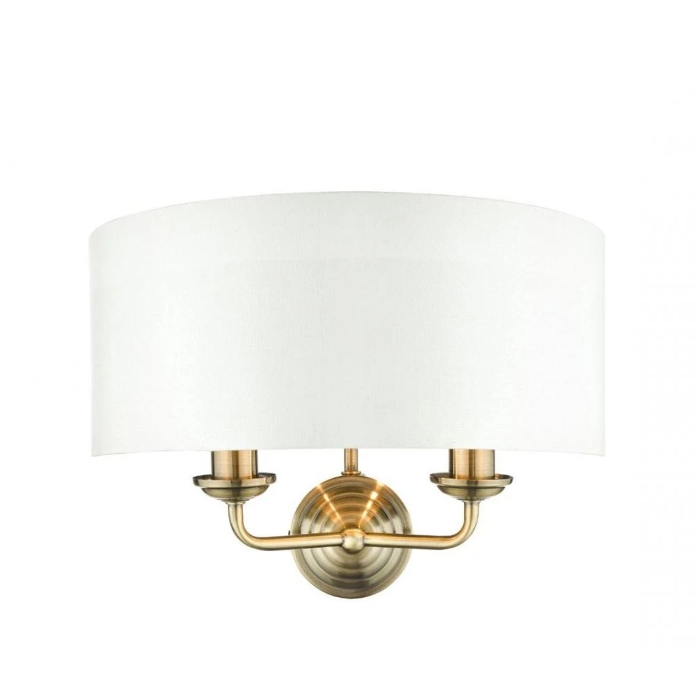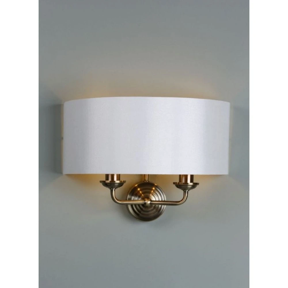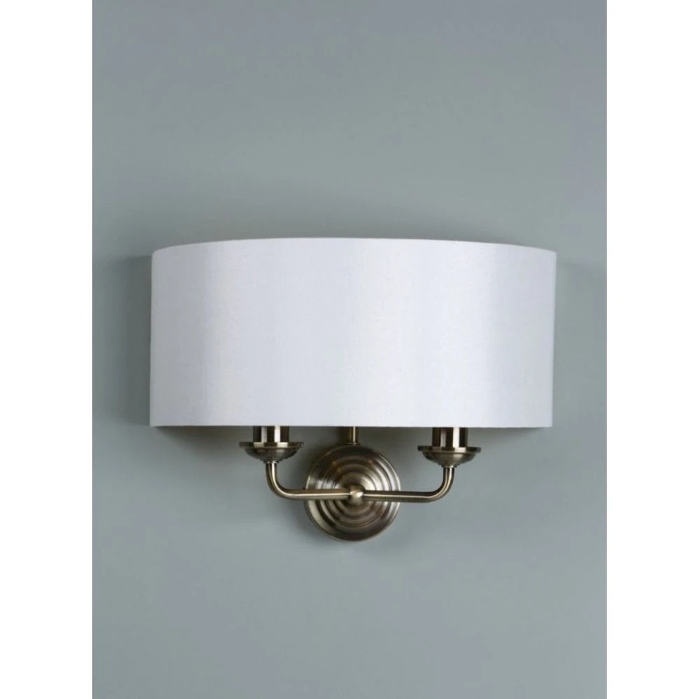 Sophisticated and stylish, the Sorrento double wall light from Laura Ashley boasts two lights on arms, both encased in a single contemporary demi-drum shade in sleek ivory silk-effect fabric with a pearlised inner. This 2 light wall fitting has a round, Art Deco style, stepped wall plate, and comes in a traditional warm antique brass.Â