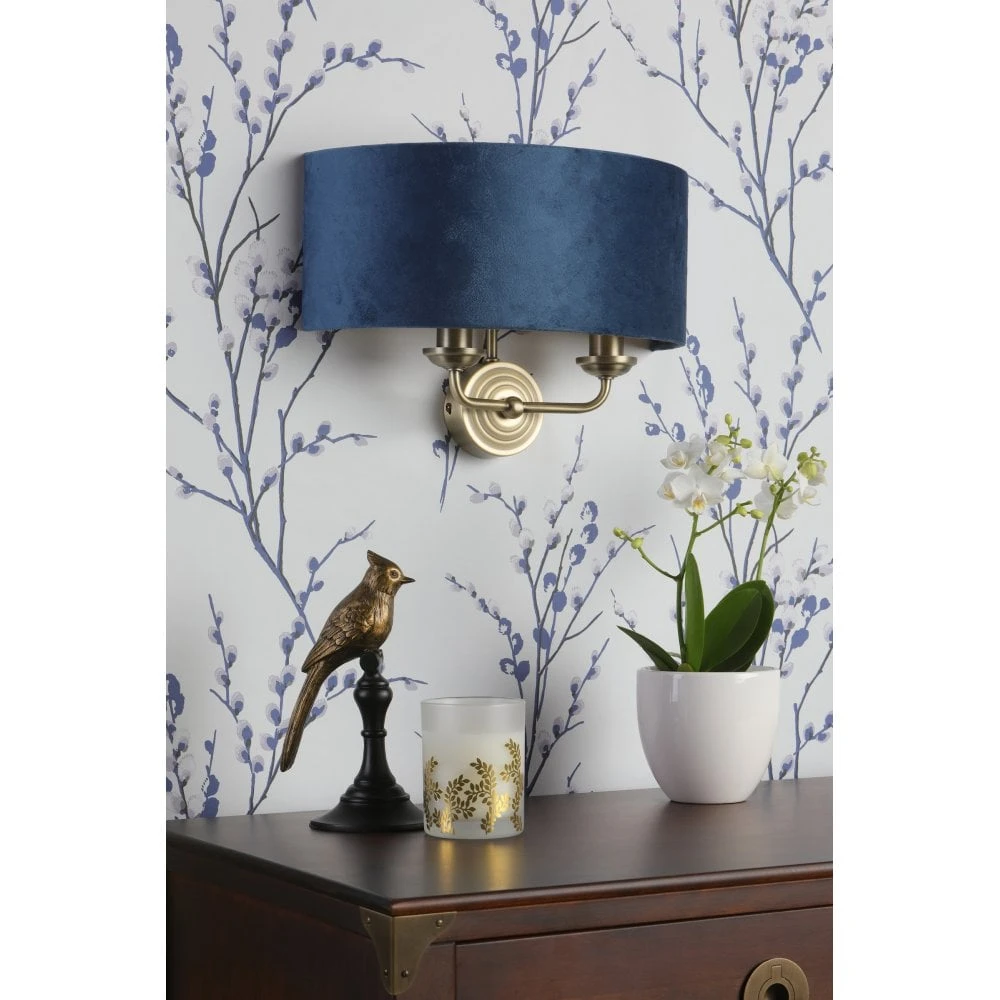 An elegant duel light wall fixture in a luxuriously warm antique brass finish, matched with a contemporary curved semi-drum shade, in a midnight blue faux silk fabric and pearlized inner. When lit, the traditional antique bronze metalwork and inner shade lining work in tandem to create a stunning array of warm ambient light.
