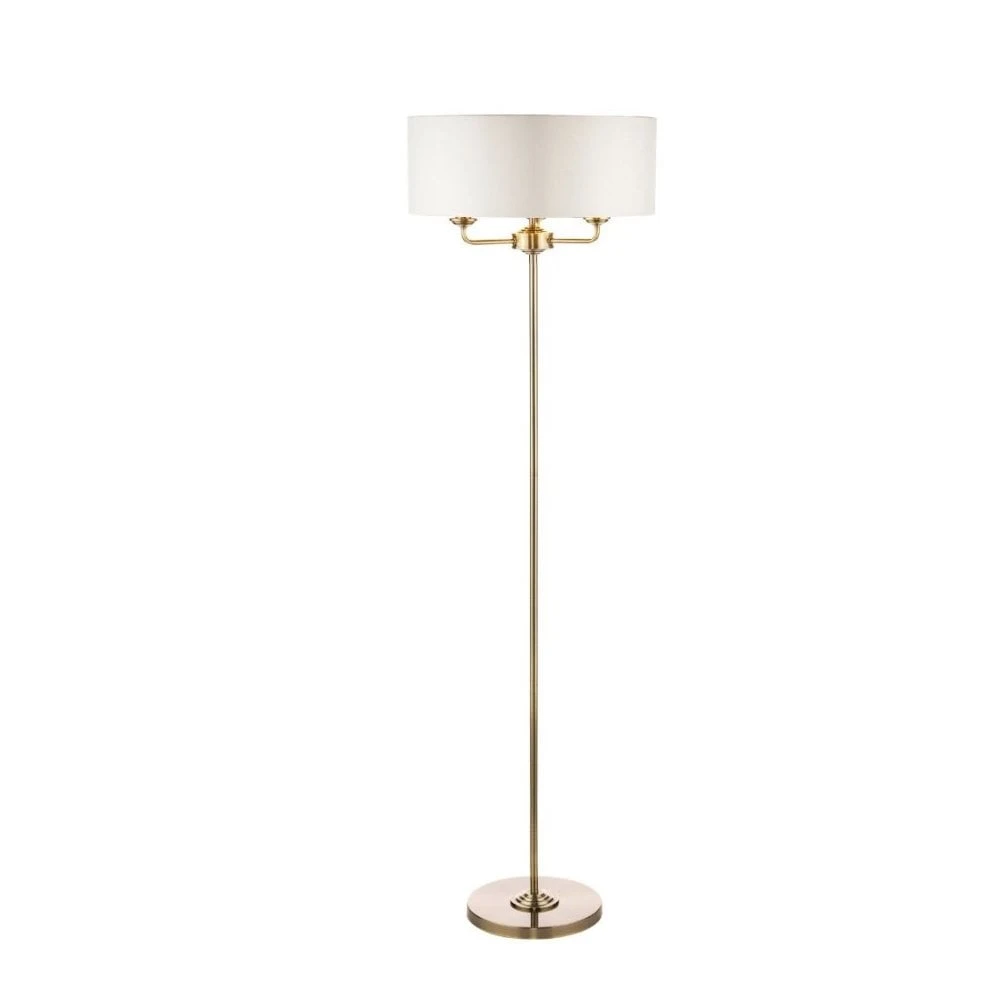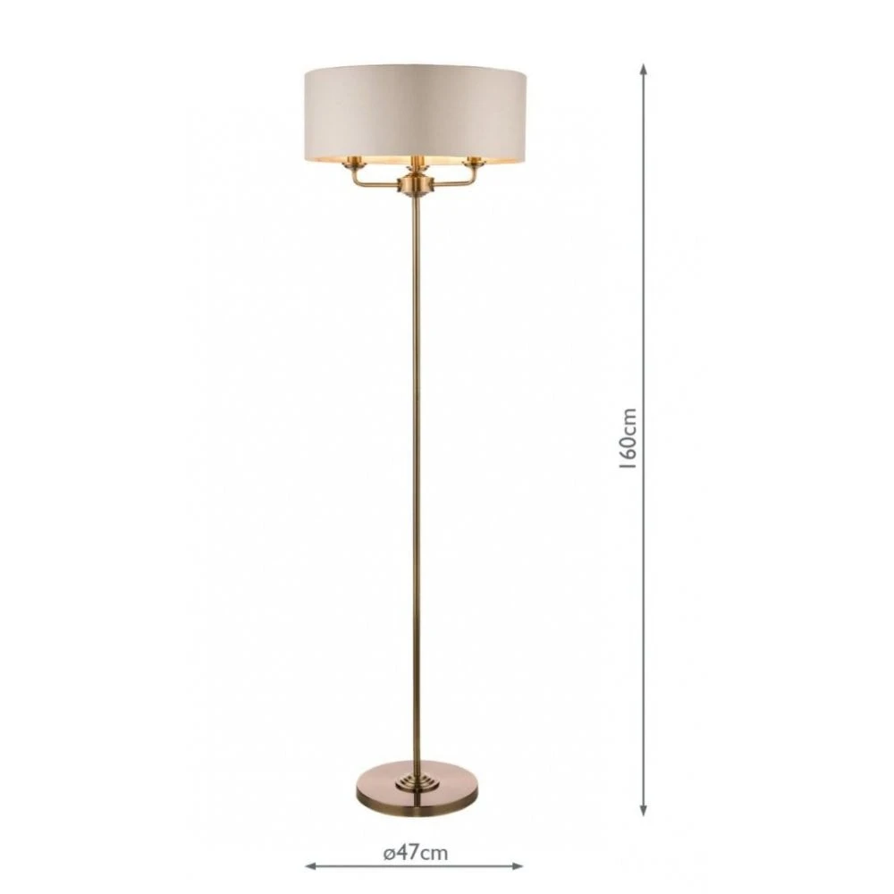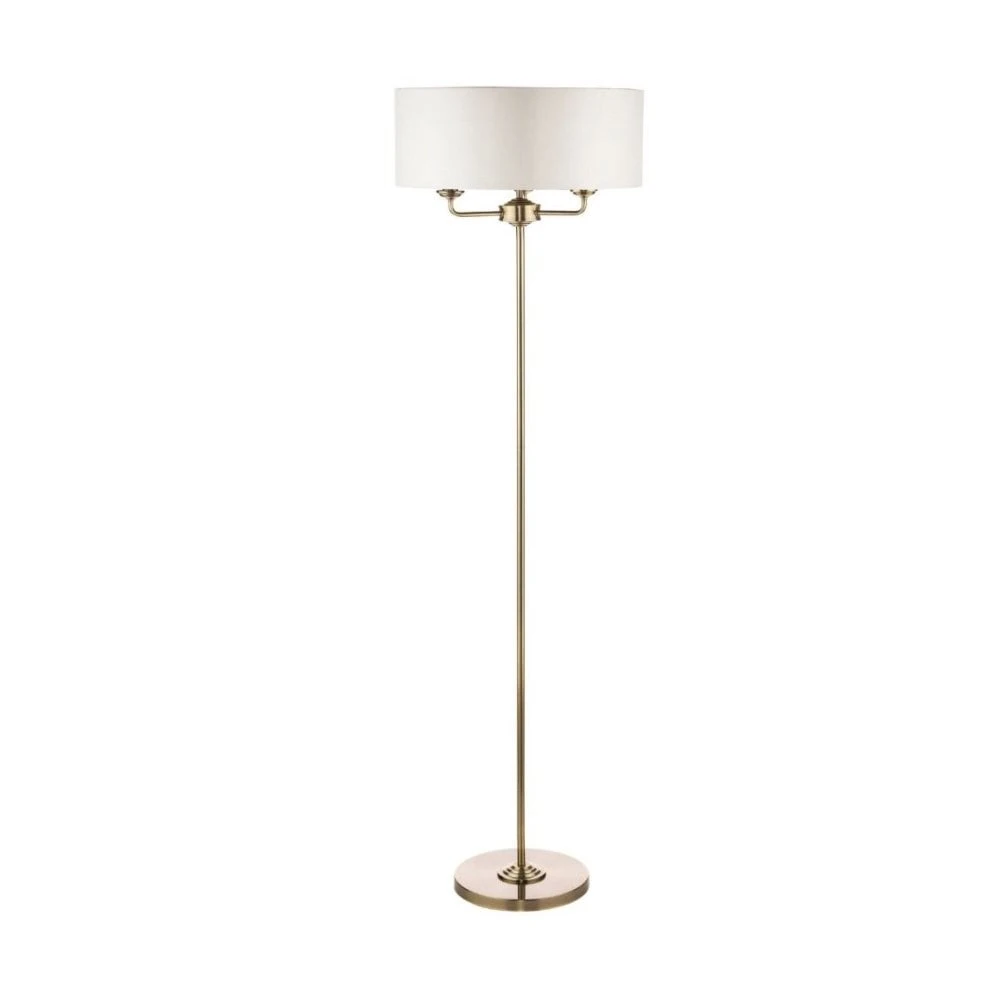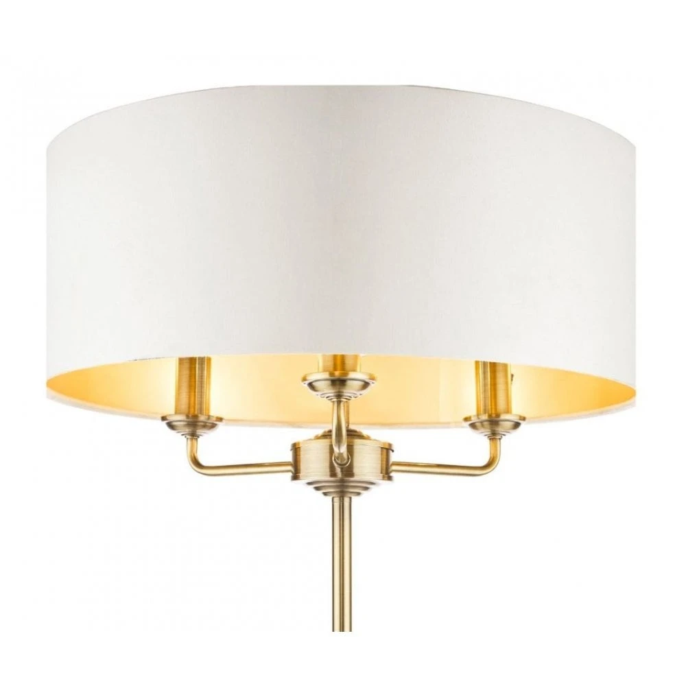 Subtle and sophisticated, the attractive Sorrento floor lamp from Laura Ashley boasts three lights on arms, all encased in a single contemporary drum shade in sleek ivory silk-effect fabric with a pearlised inner. A straight stem rises up from a round, flat base with stepped, Art Deco style detail. This triple light floor lamp comes in a traditional warm antique brass finish, adding sophistication to your dining or living area. This floor lamp has a coordinating gold cable with a convenient foot switch. This fitting is class 2 double insulated, meaning it can be used in all homes, including those that do not have an Earth Wire.Â