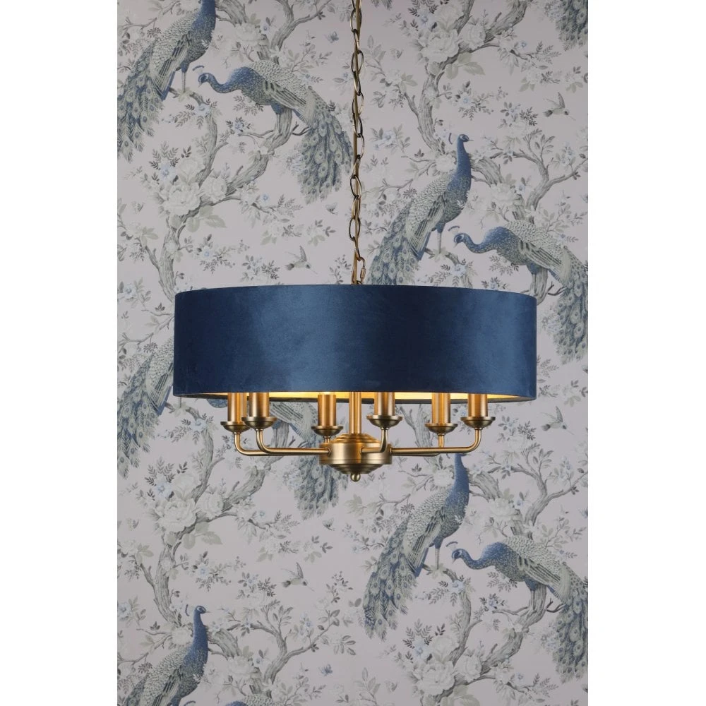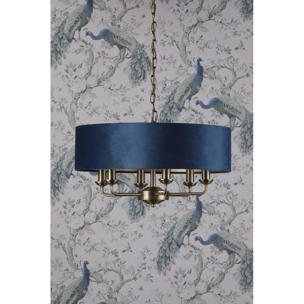 A signature ceiling pendant by Laura Ashley; the Sorrento, features a luxury 6-arm display in an antique brass finish with a large midnight blue toned shade. This ceiling pendant will act as a true statement piece in any living room or dining area, looking particularly grand above a dining table.