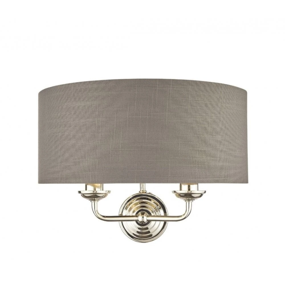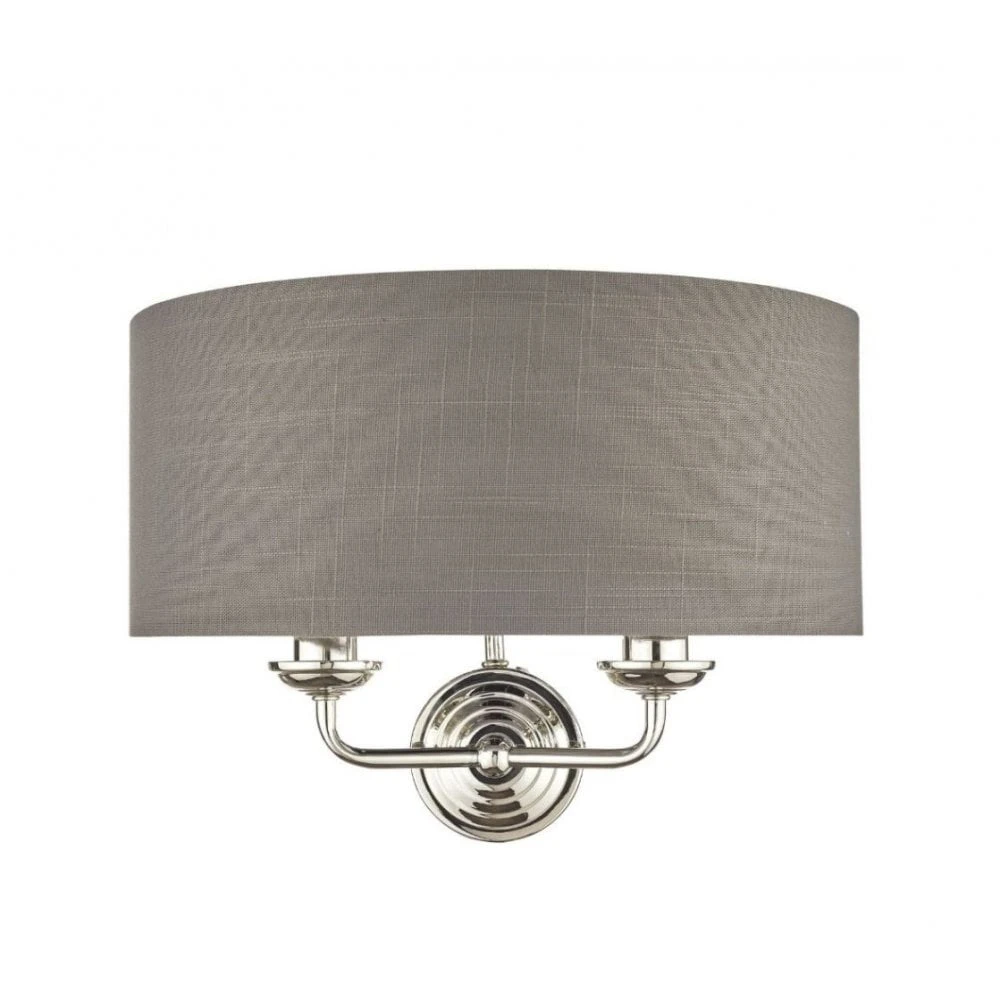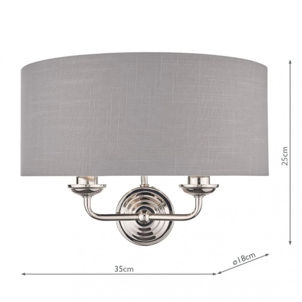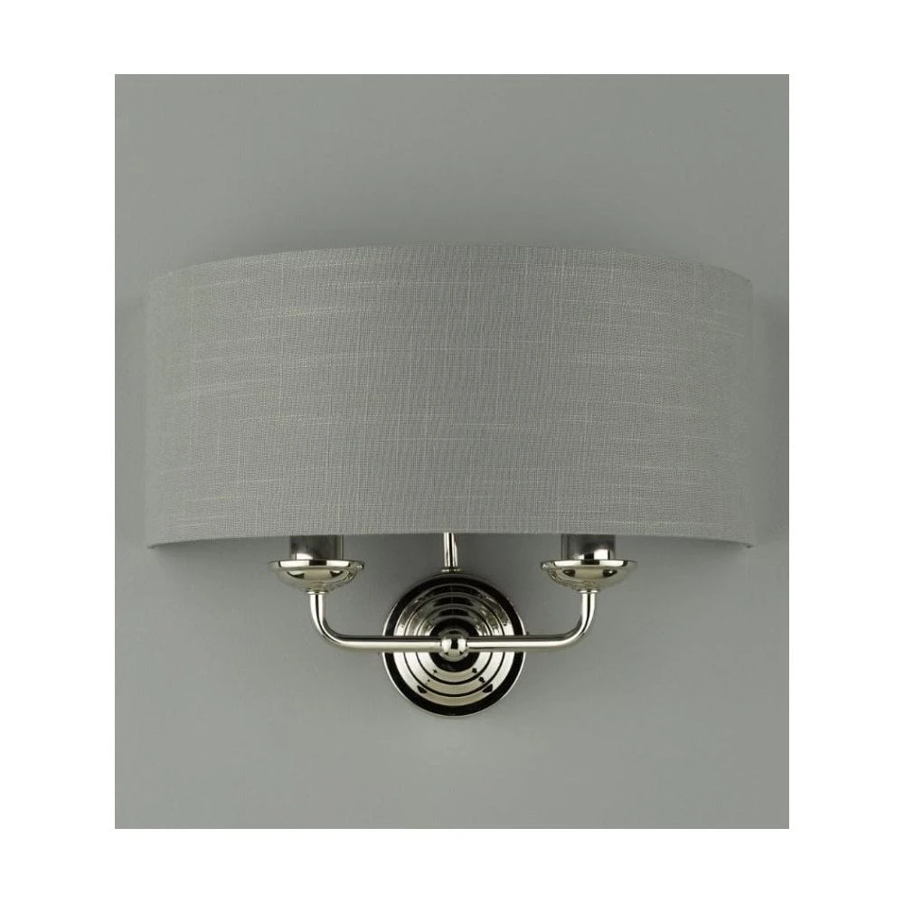 Sophisticated and stylish, the Sorrento double wall light from Laura Ashley boasts two lights on arms, both encased in a single contemporary demi-drum shade in charcoal grey linen with a metallic silver inner. This 2 light wall fitting has a round, Art Deco style, stepped wall plate, and comes in a modern polished nickel finish. This fitting is class 2 double insulated meaning it is safe to use in all homes including those that do not have an Earth Wire.Â