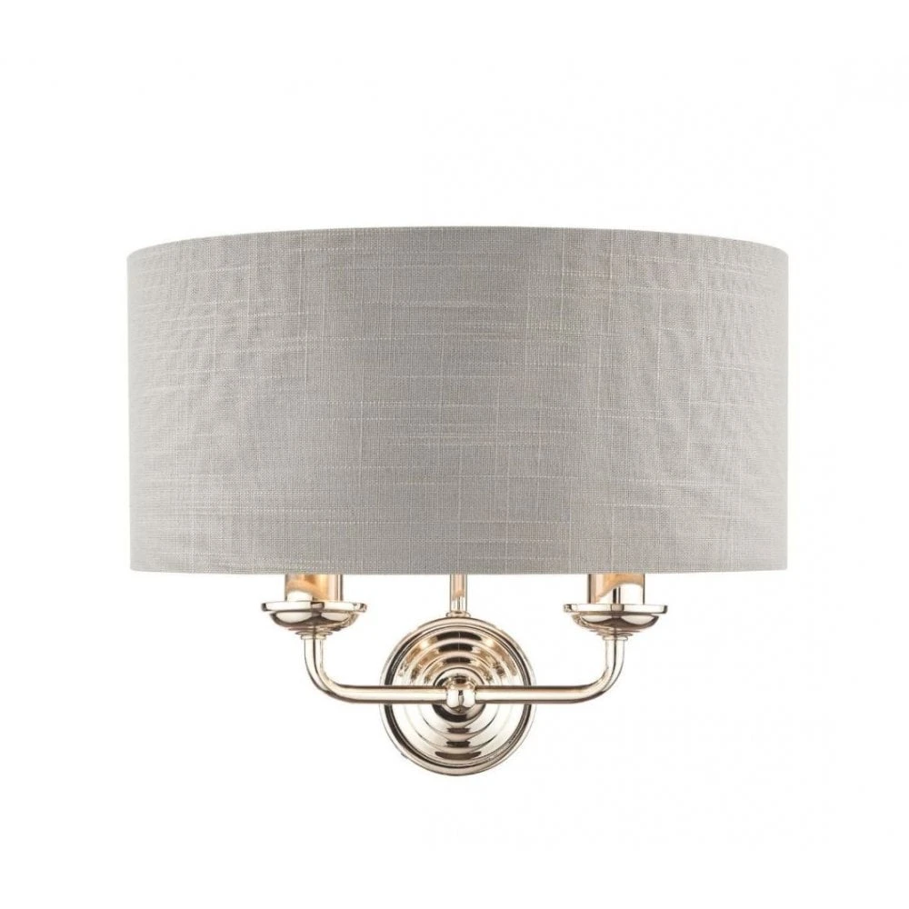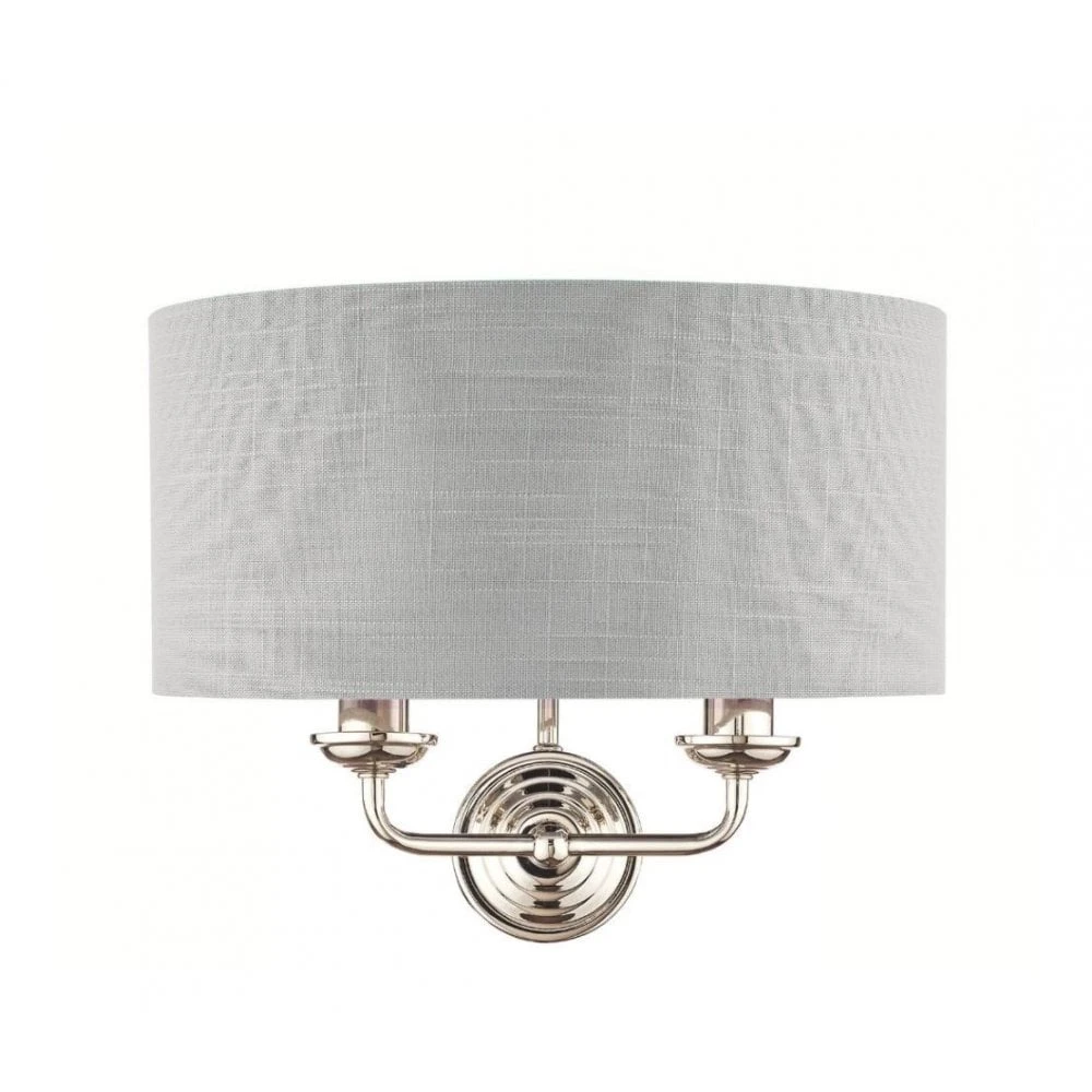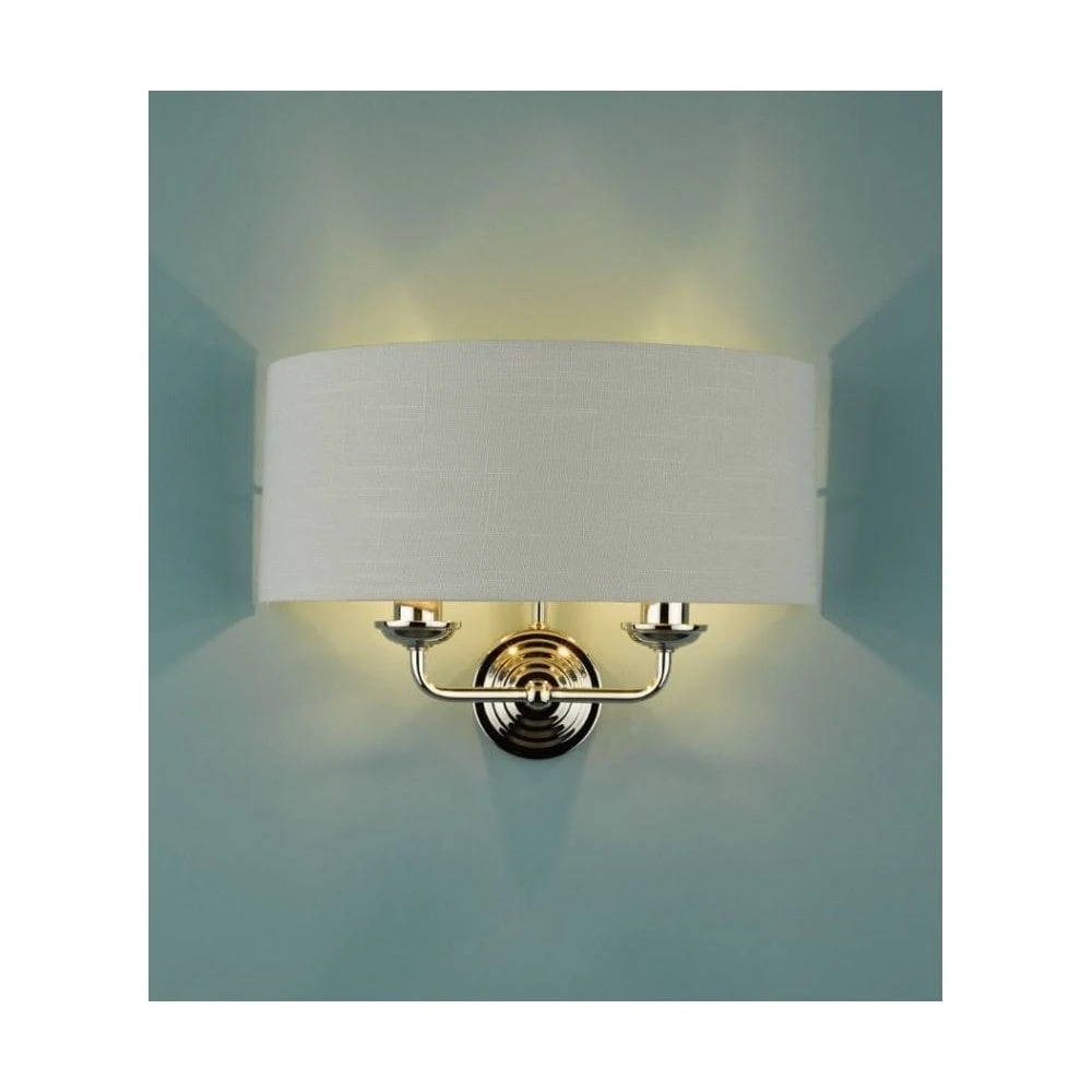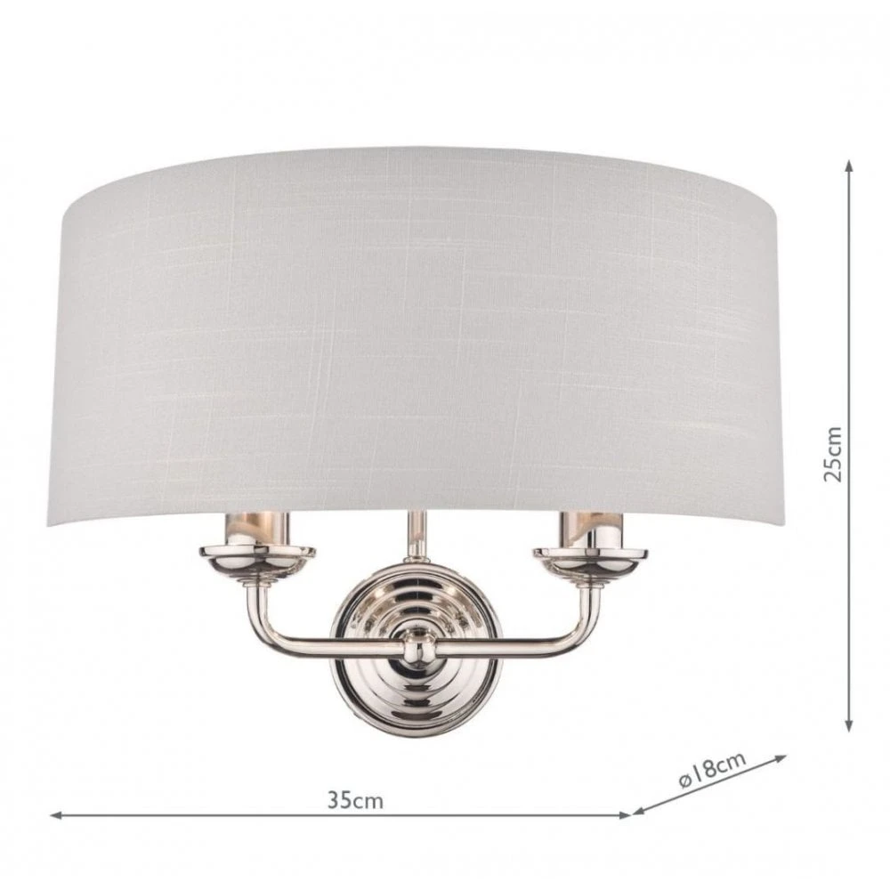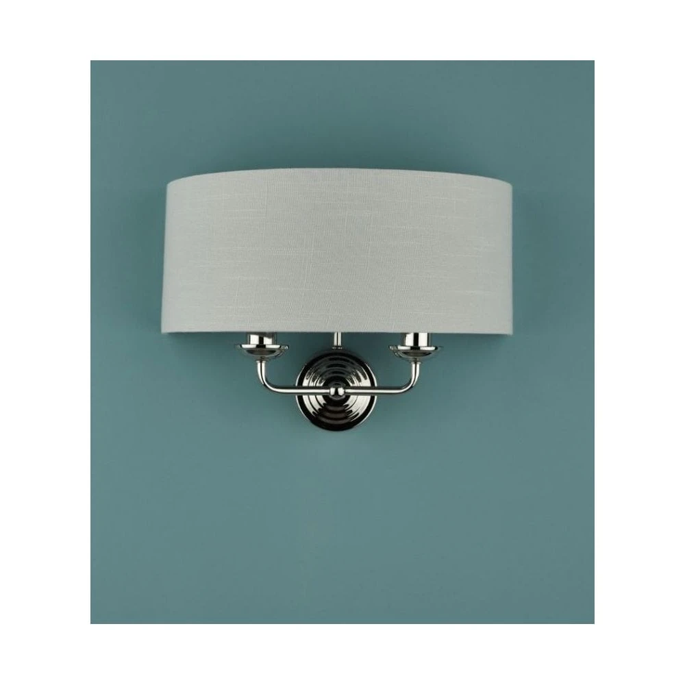 Sophisticated and stylish, the Sorrento double wall light from Laura Ashley boasts two lights on arms, both encased in a single contemporary demi-drum shade in silver linen with a metallic silver inner. This 2 light wall fitting has a round, Art Deco style, stepped wall plate, and comes in a velvety brushed chrome finish.