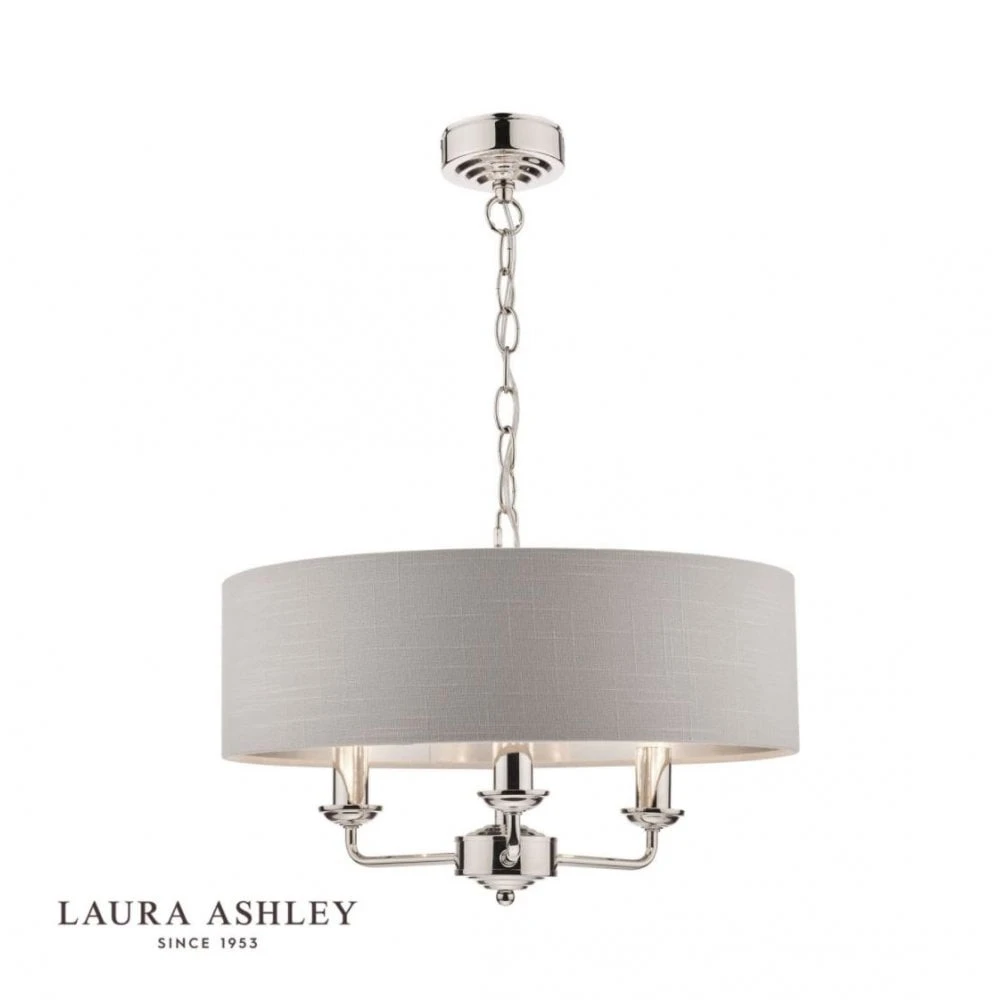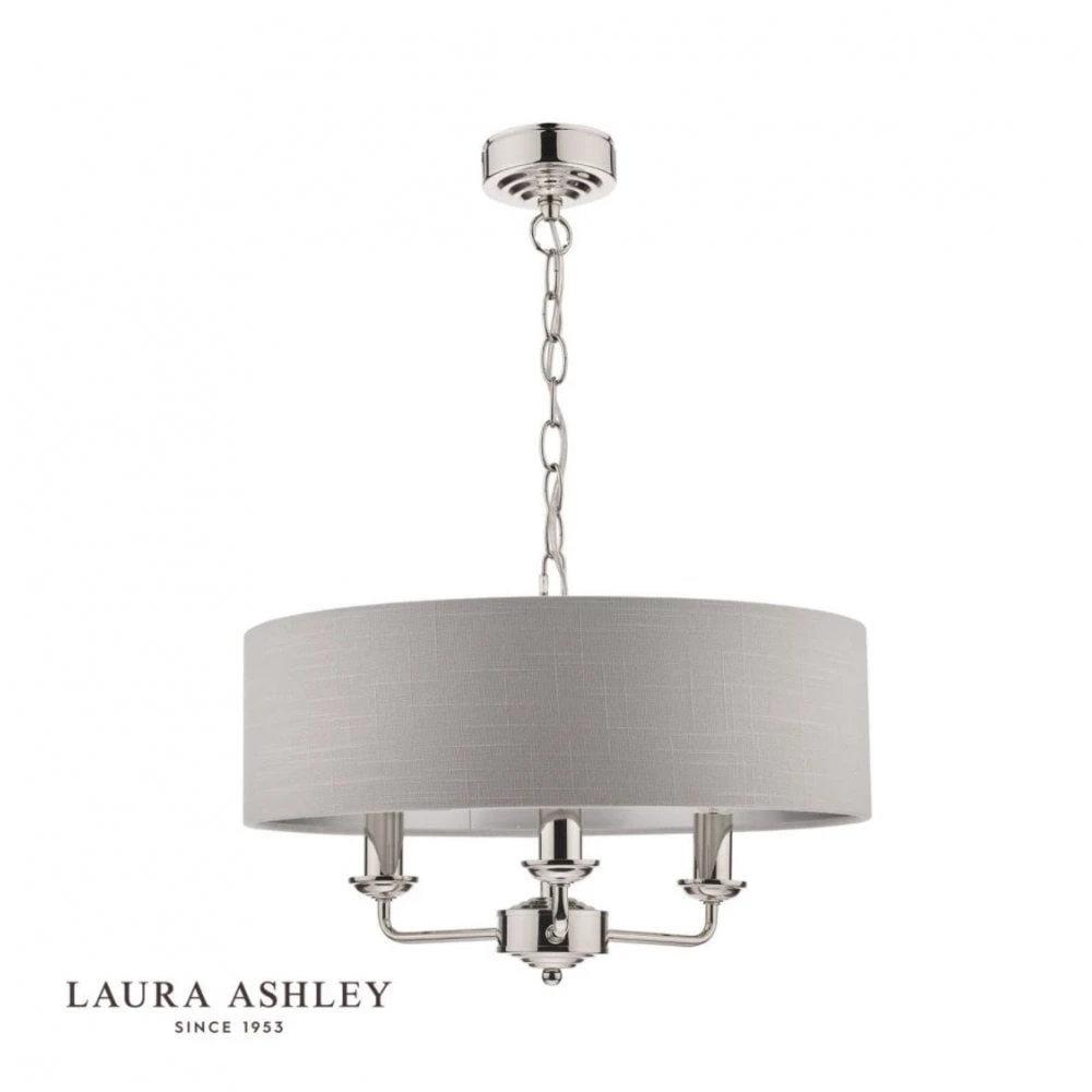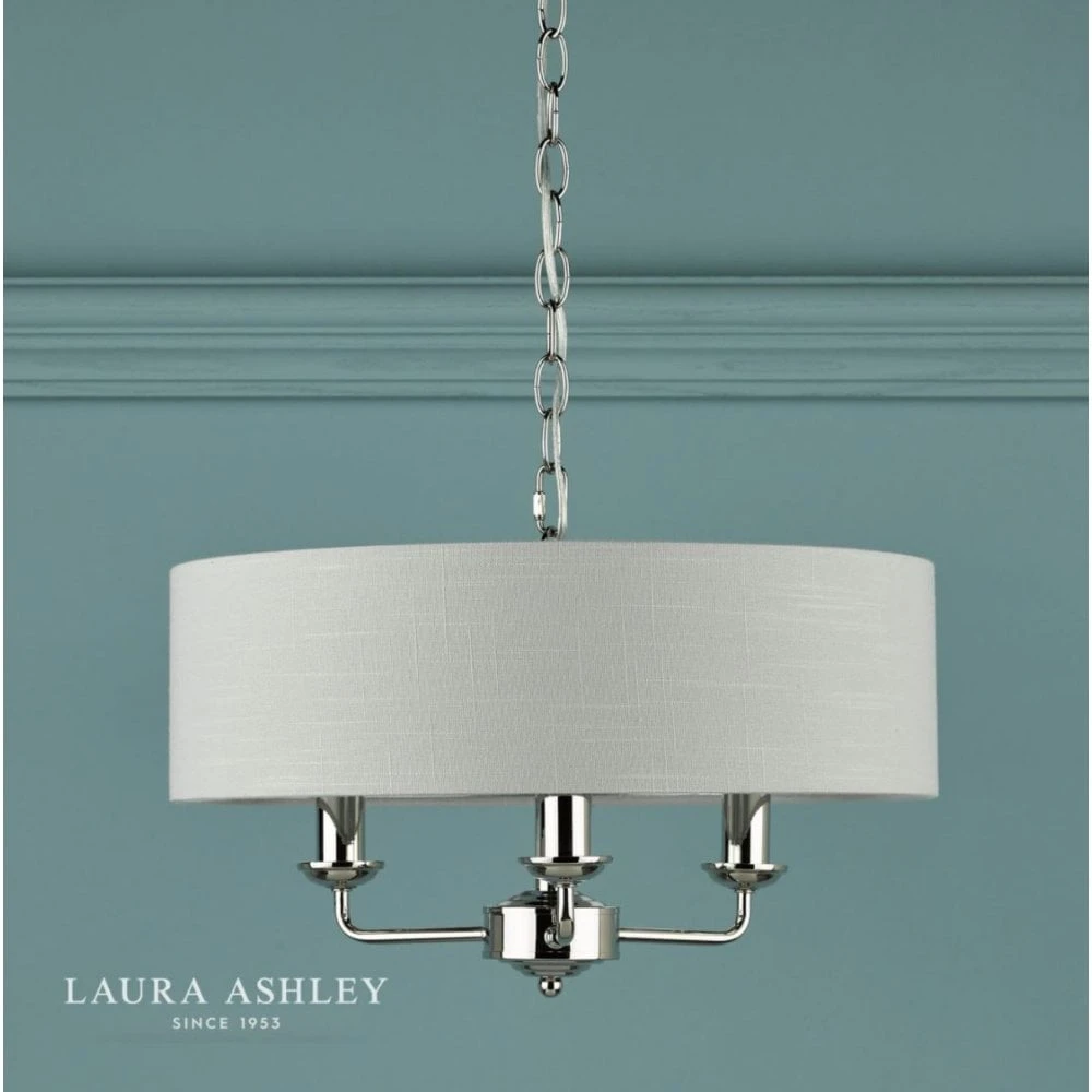 Subtle and sophisticated, the attractive Sorrento ceiling light from Laura Ashley boasts three arms, all encased in a single contemporary drum shade silver linen with a metallic silver inner. A hanging chain falls from a round, Art Deco style, stepped ceiling rose. This 3 light ceiling pendant comes in a traditional warm antique brass finish. This ceiling pendant light has a matching finish ceiling rose and hanging chain plus a coordinating gold cable. The height is adjustable during installation to suit a variety of different ceiling heights.Â
