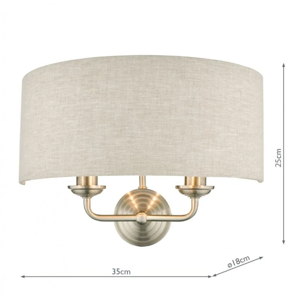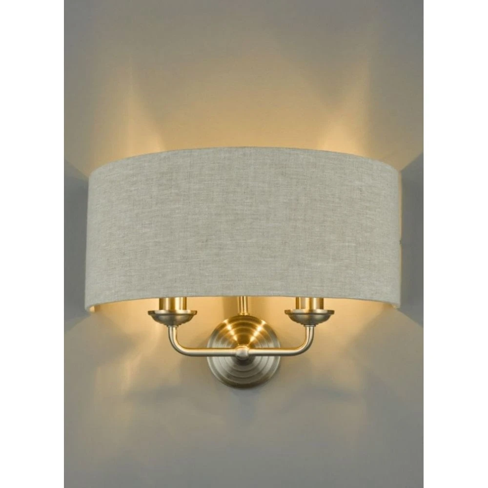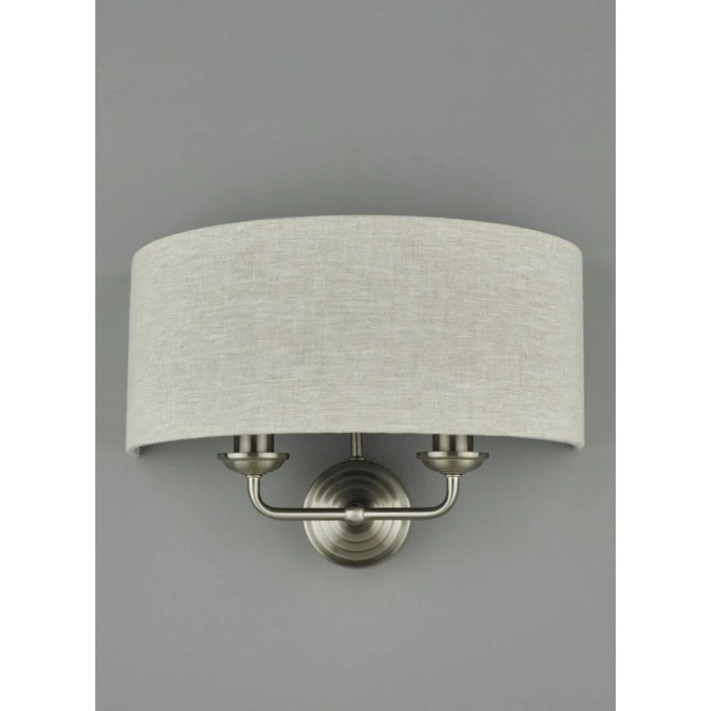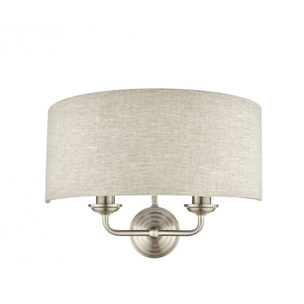 Sophisticated and stylish, the Sorrento double wall light from Laura Ashley boasts two lights on arms, both encased in a single contemporary demi-drum shade in sleek nature linen fabric with a metallic silver inner. This 2 light wall fitting has a round, Art Deco style, stepped wall plate, and comes in a velvety satin nickel finish. This fitting is class 2 double insulated meaning it is safe to use in all homes including those that do not have an Earth Wire.Â