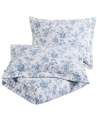 - Design details: the laura ashley walled garden quilt-sham set highlights a refreshing cool blue in a sophisticated floral toile pattern that is printed on crisp white. reverses to the opposite floral pattern in white on a light blue ground.prewashed for softness, this 100% cotton quilt set becomes cozier with each wash. filled with a blend of 80% cotton/20% poly it is light weight yet can be layered for year-round use. set includes one quilt and two shams for full/queen and king size, one sham for twin size. machine washable for easy care