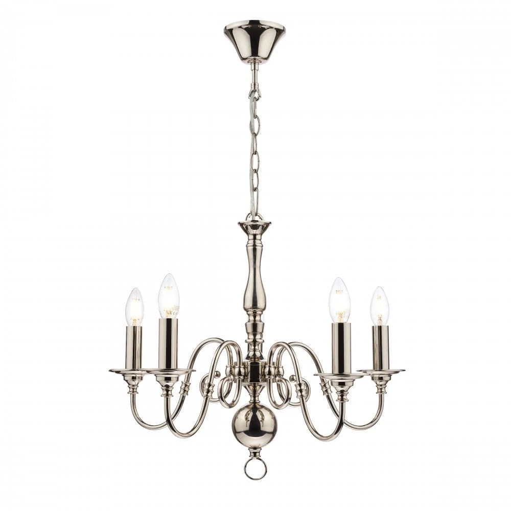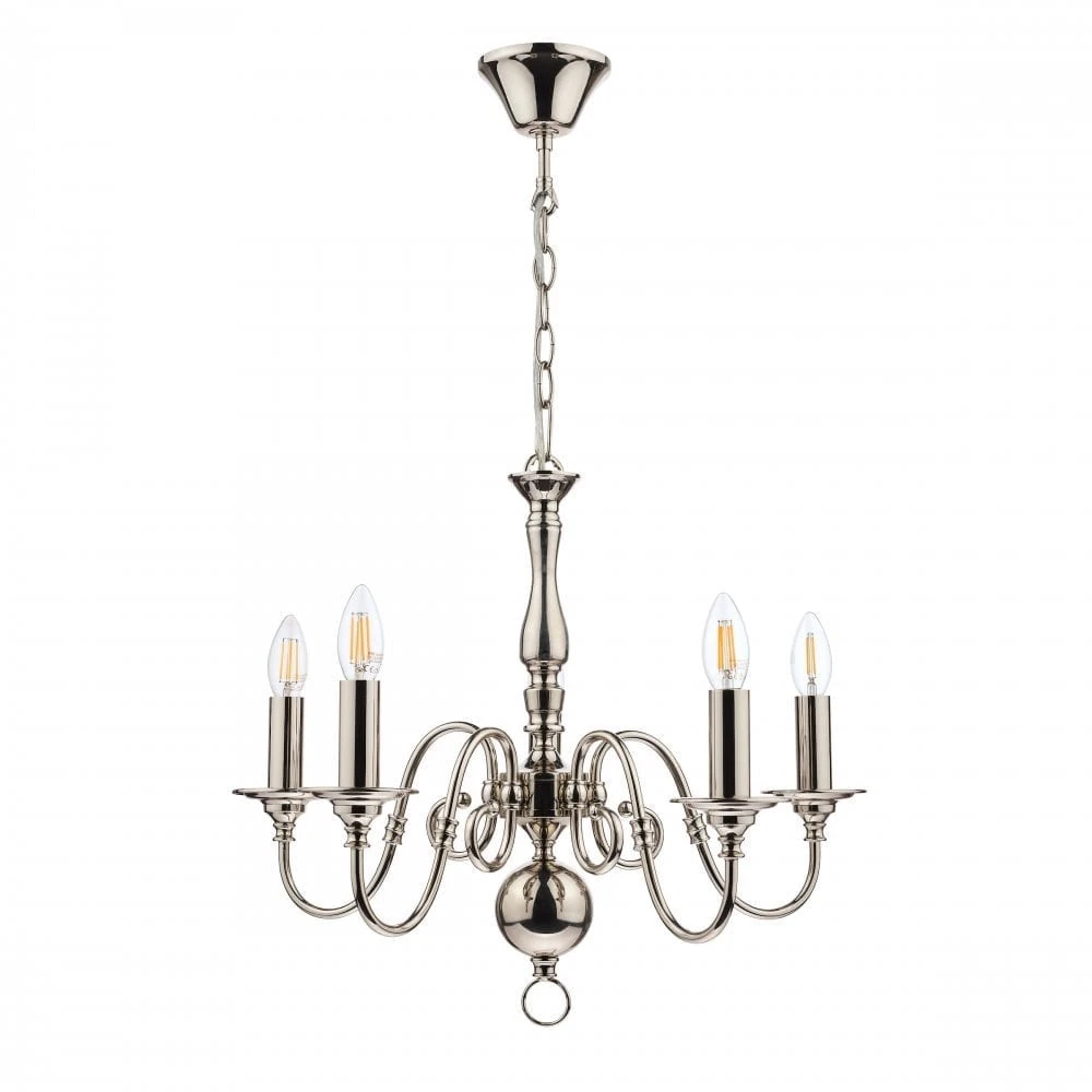 A luxury 5 light chandelier in a polished chrome finish with a beautifully elegant design. This chandelier features five, thin, curved arms, each holding a candle stick styled lamp holder. The central frame features a chrome sphere and a spindle column to complete the magnificent look. This chandelier would look perfect hanging gallantly above a dining table or as your living room centre piece. Â